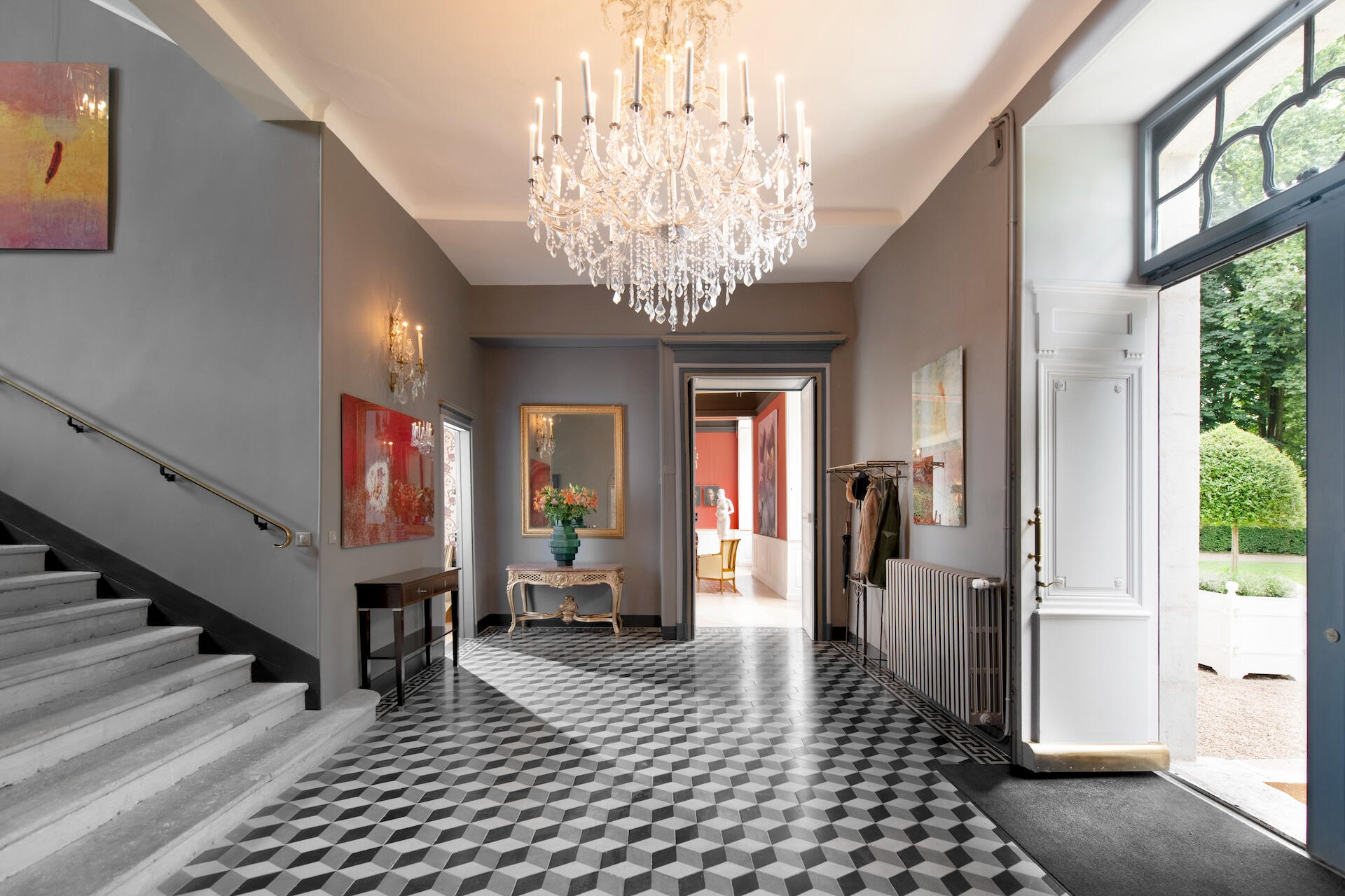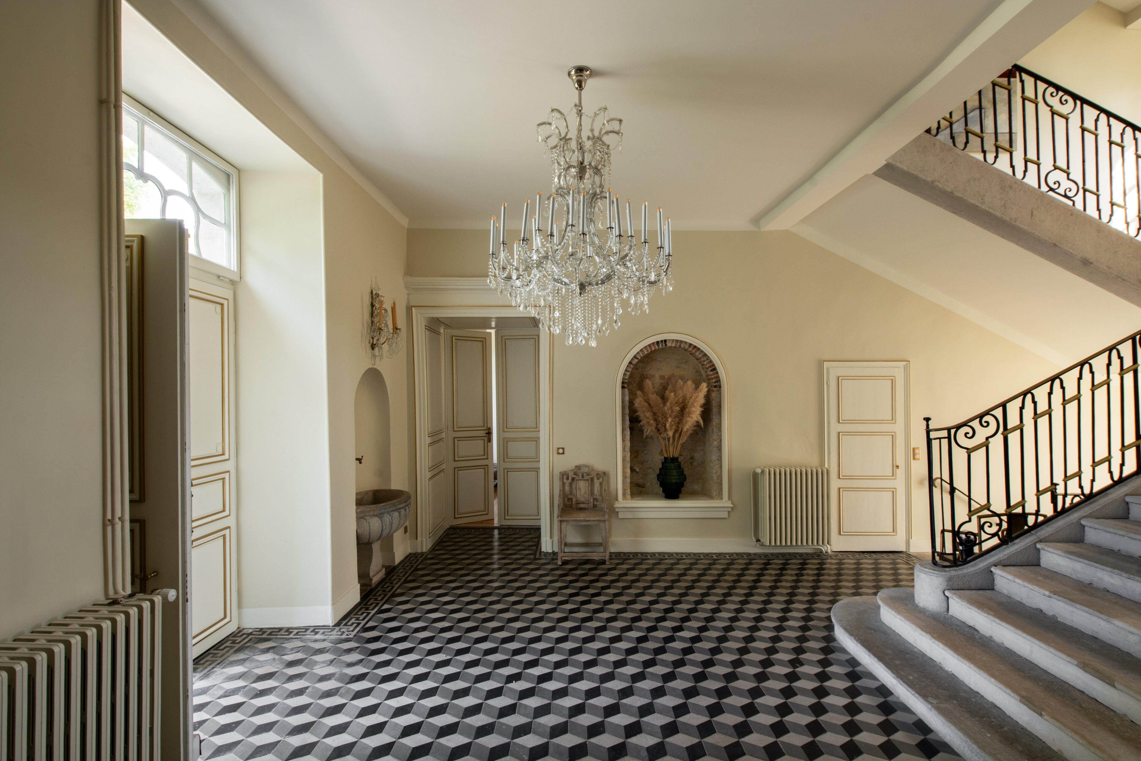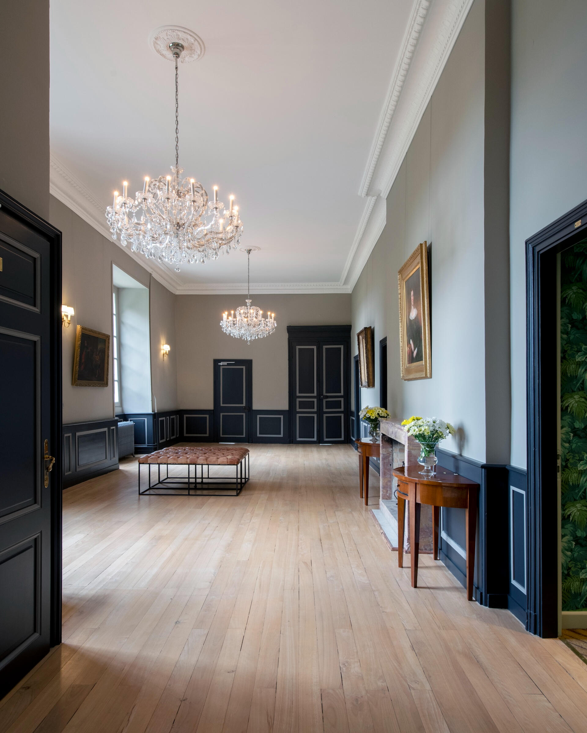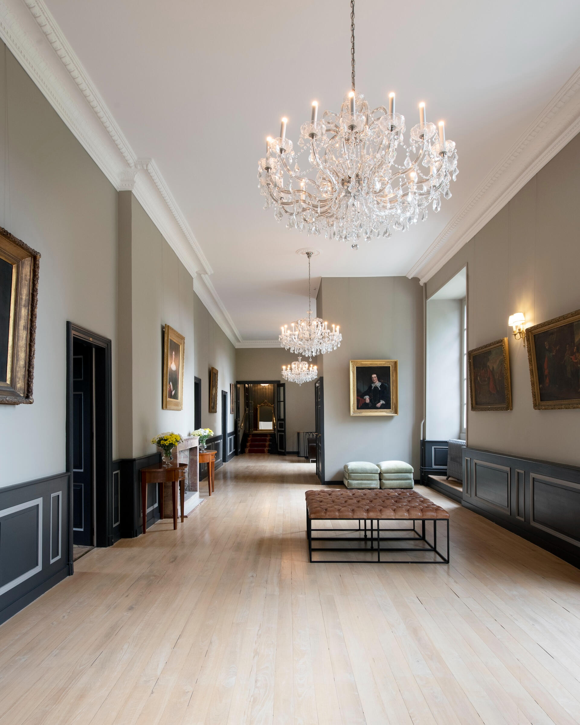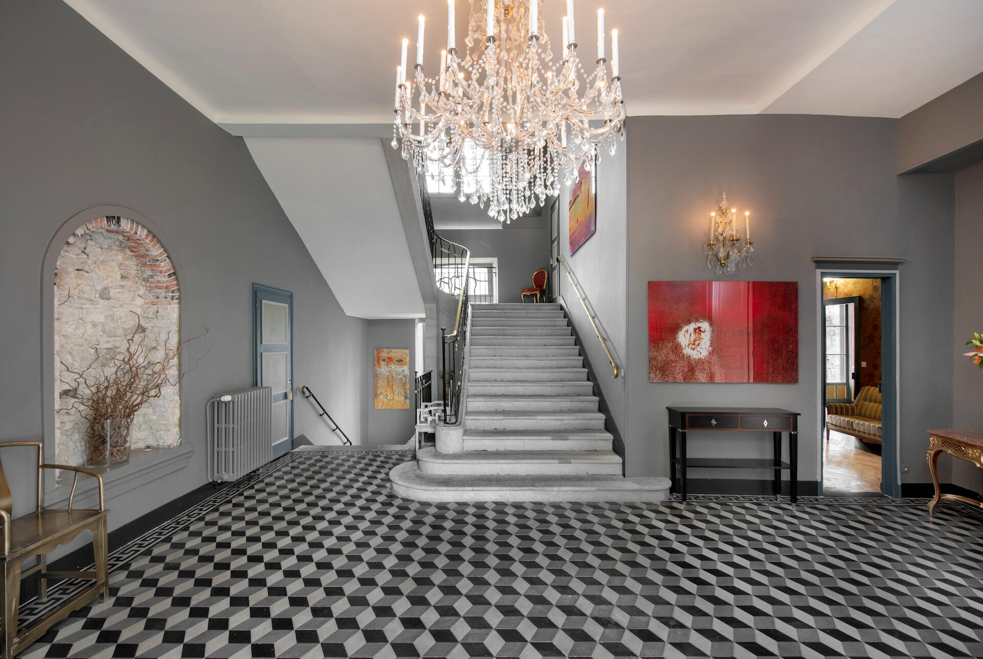 The reception rooms open with an entrance hall of geometric tiled floors beneath a grand crystal chandelier. Beyond it unfold a gallery, an antechamber, a concert salon – a remarkable room with four corner fireplaces, mirrors facing one another, and original period woodwork – and a dining room. Contemporary art and antique furniture meet from room to room, carried by the same exposed stone and the light of tall windows.
