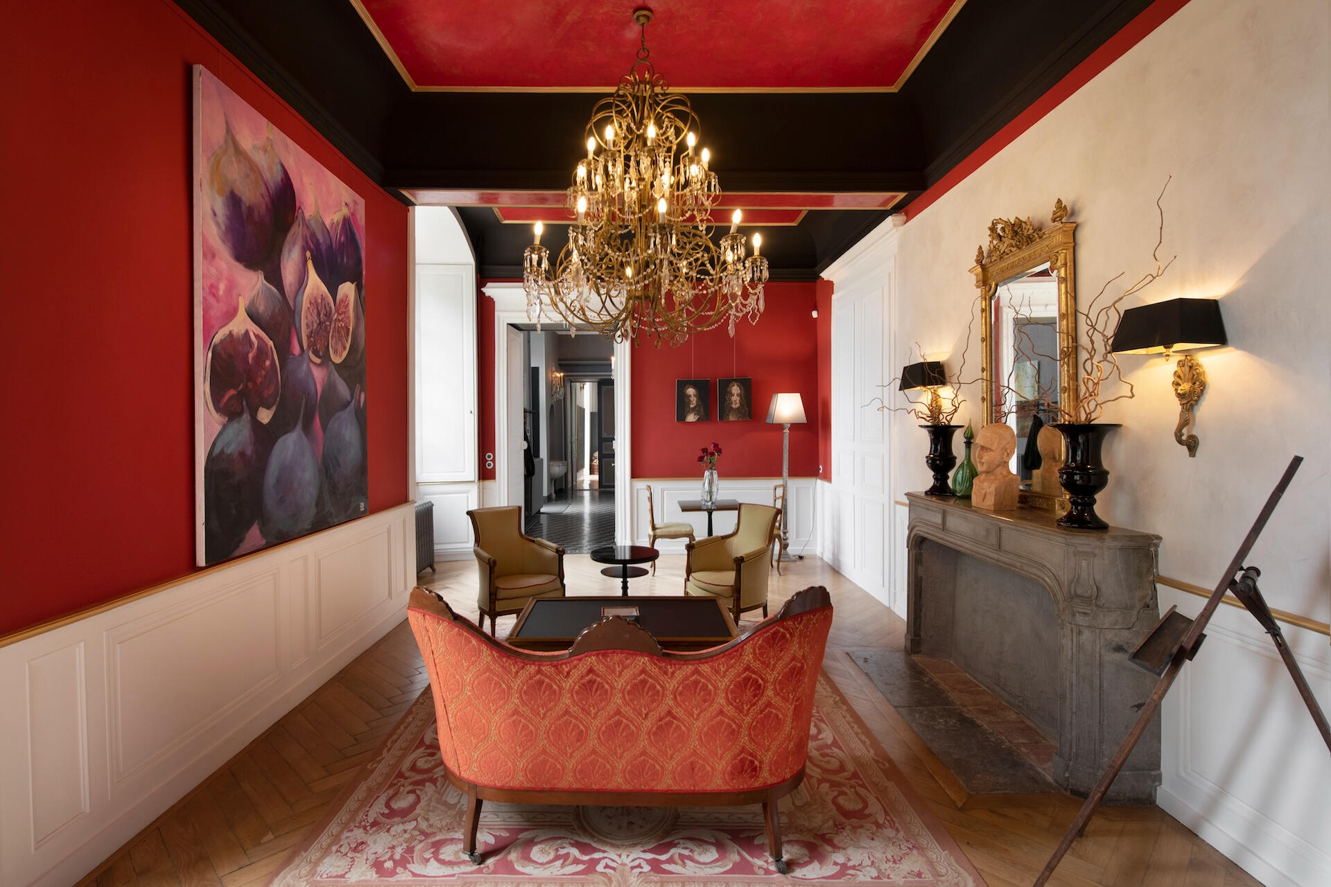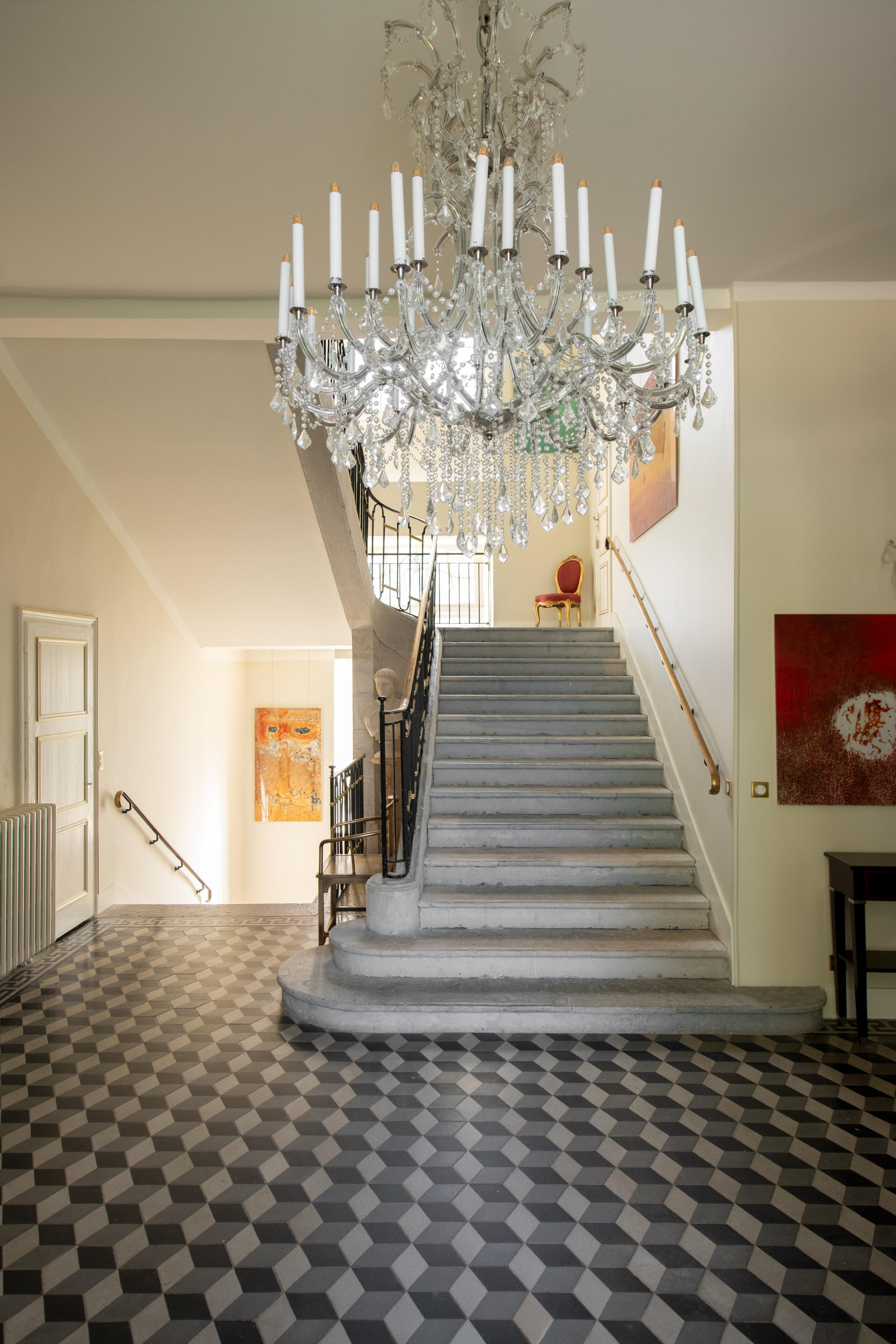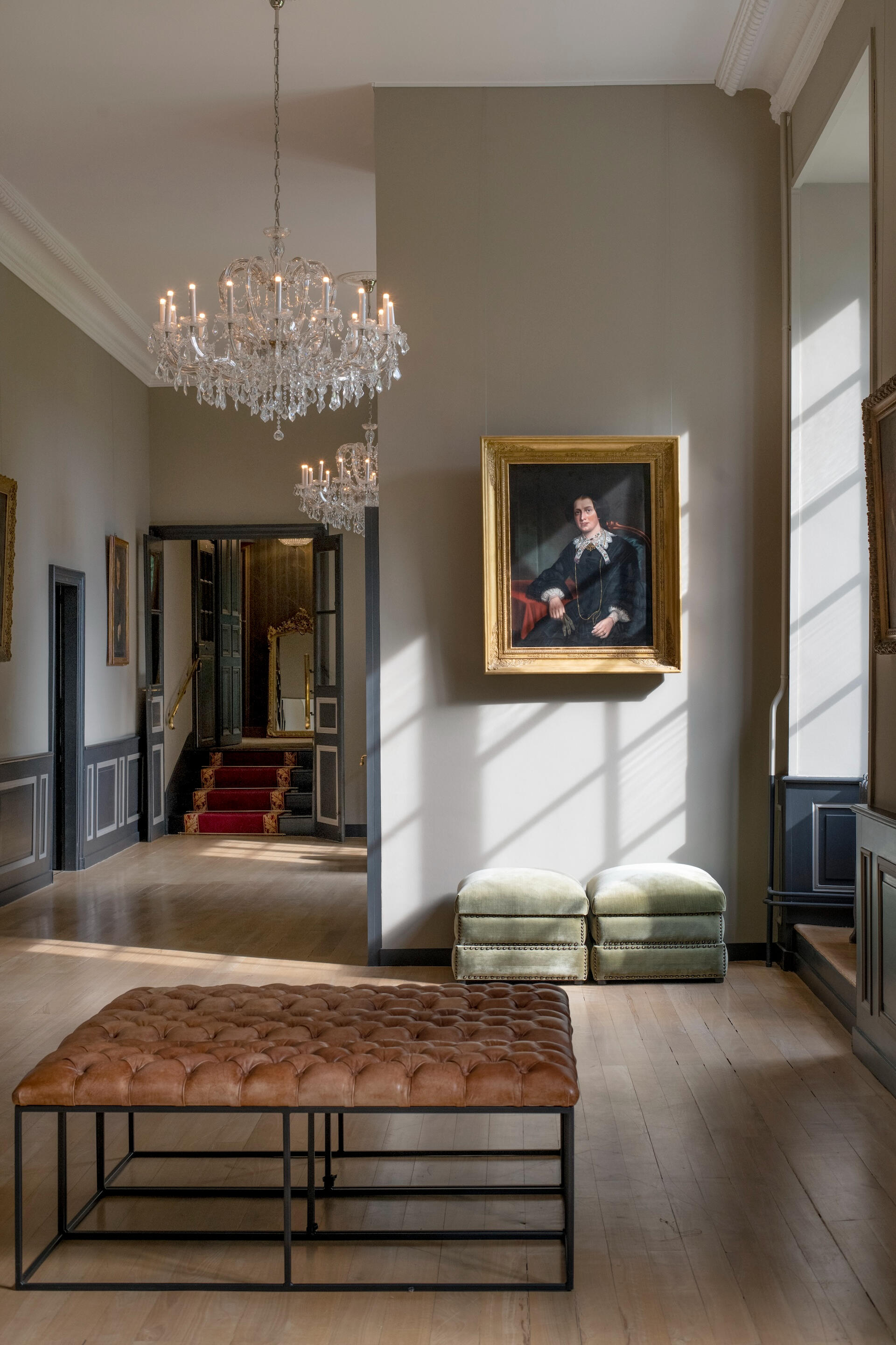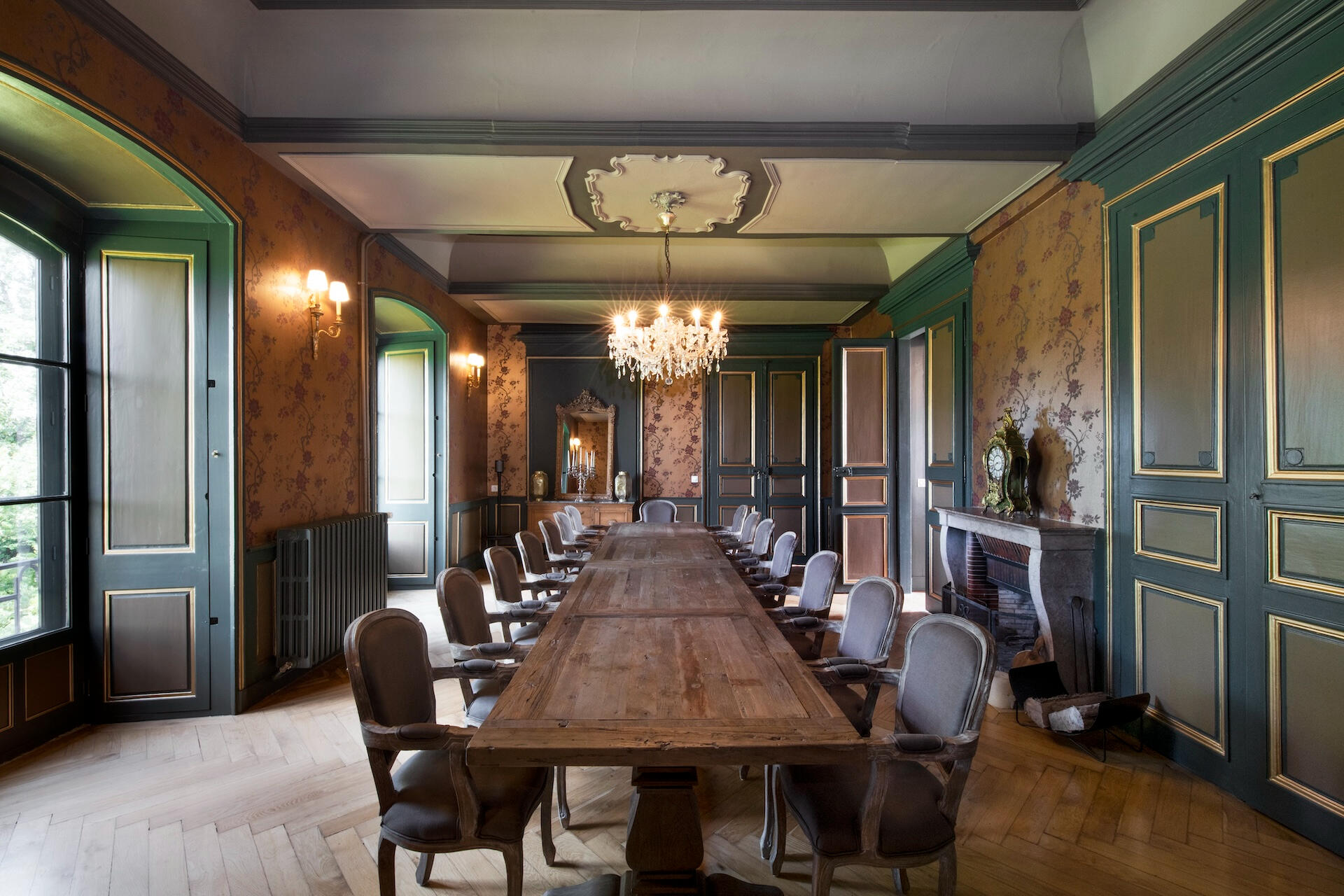 The reception rooms open with an entrance hall of geometric tiled floors beneath a grand crystal chandelier. Beyond it unfold a gallery, an antechamber, a concert salon – a remarkable room with four corner fireplaces, mirrors facing one another, and original period woodwork – and a dining room. Contemporary art and antique furniture meet from room to room, carried by the same exposed stone and the light of tall windows.