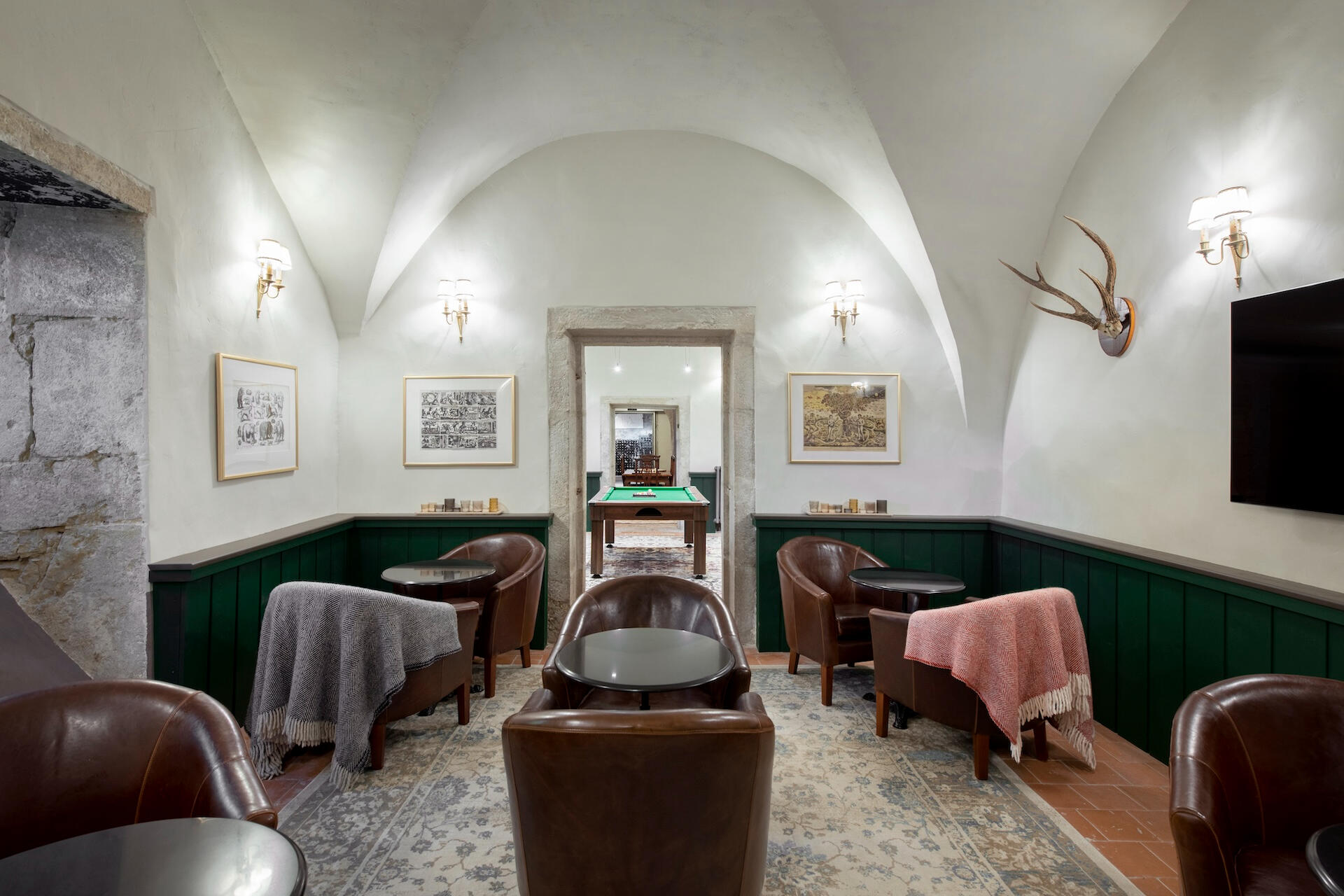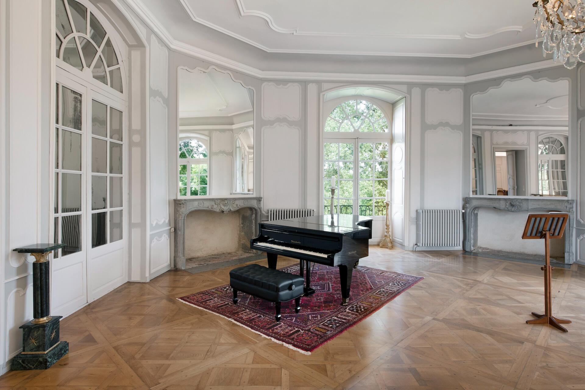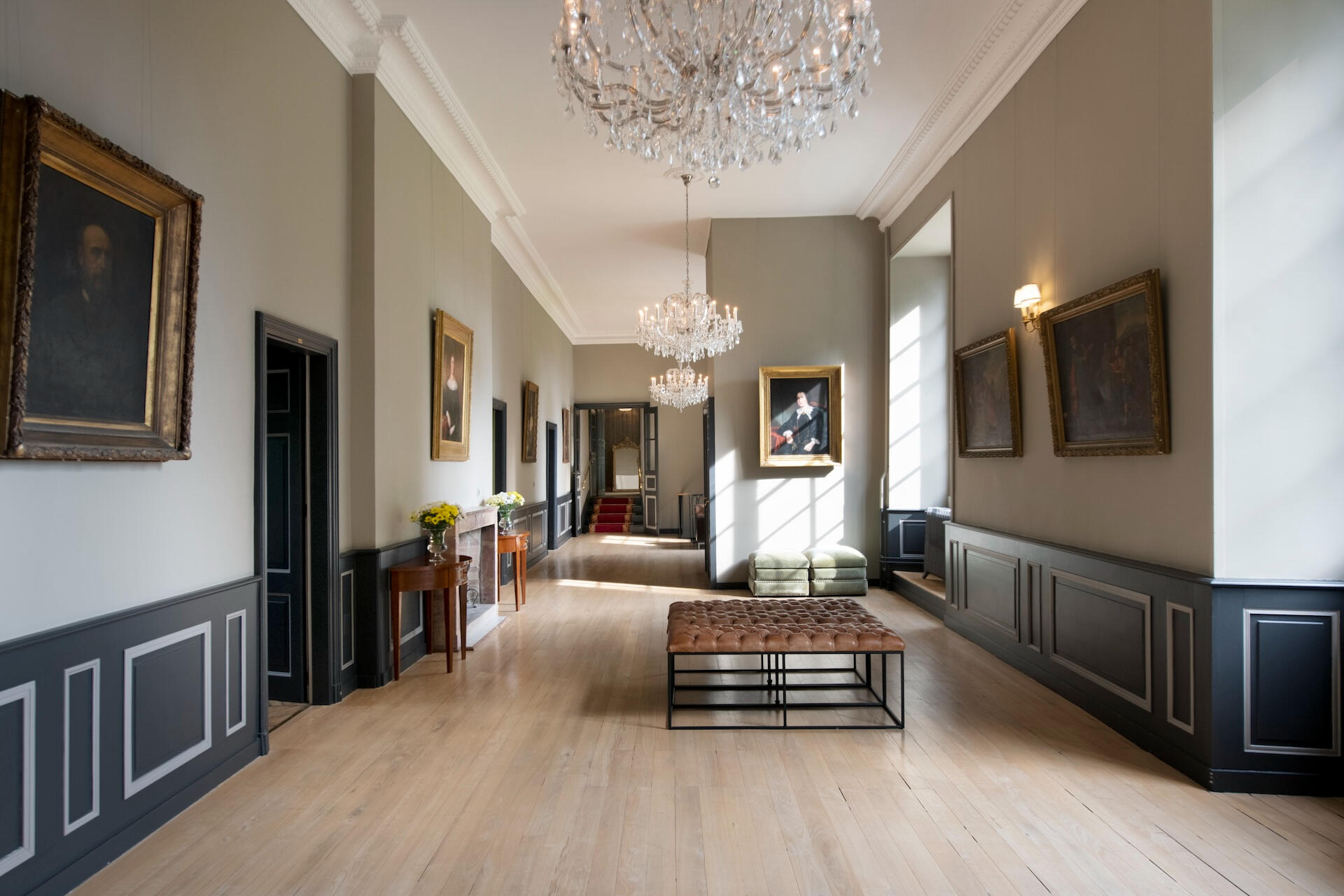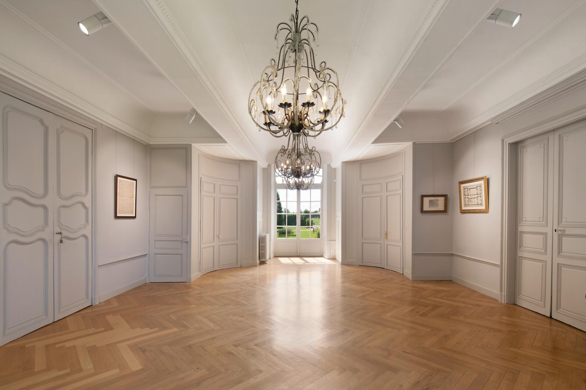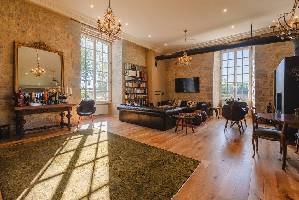 The reception rooms open with an entrance hall of geometric tiled floors beneath a grand crystal chandelier. Beyond it unfold a gallery, an antechamber, a concert salon – a remarkable room with four corner fireplaces, mirrors facing one another, and original period woodwork – and a dining room. Contemporary art and antique furniture meet from room to room, carried by the same exposed stone and the light of tall windows.
