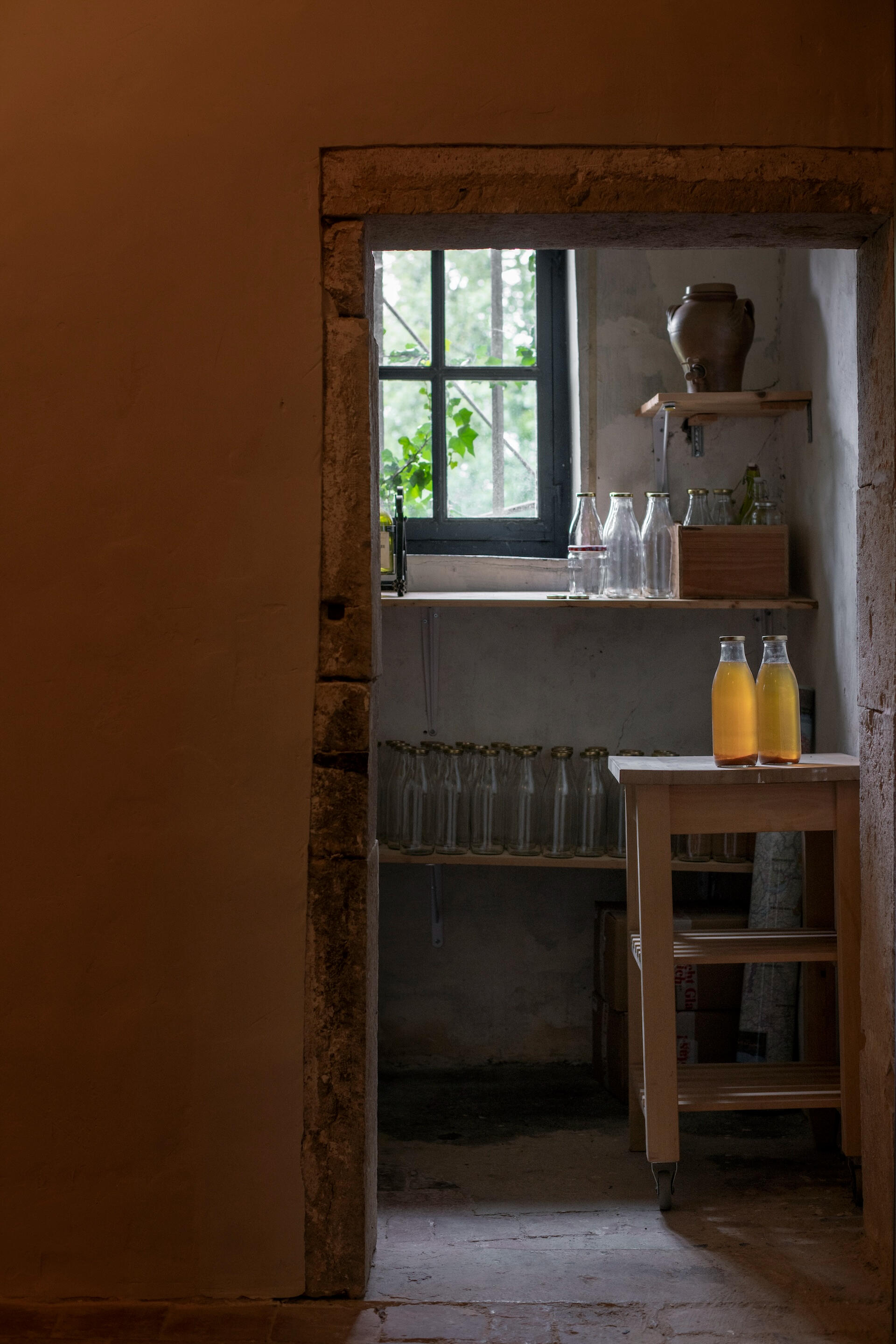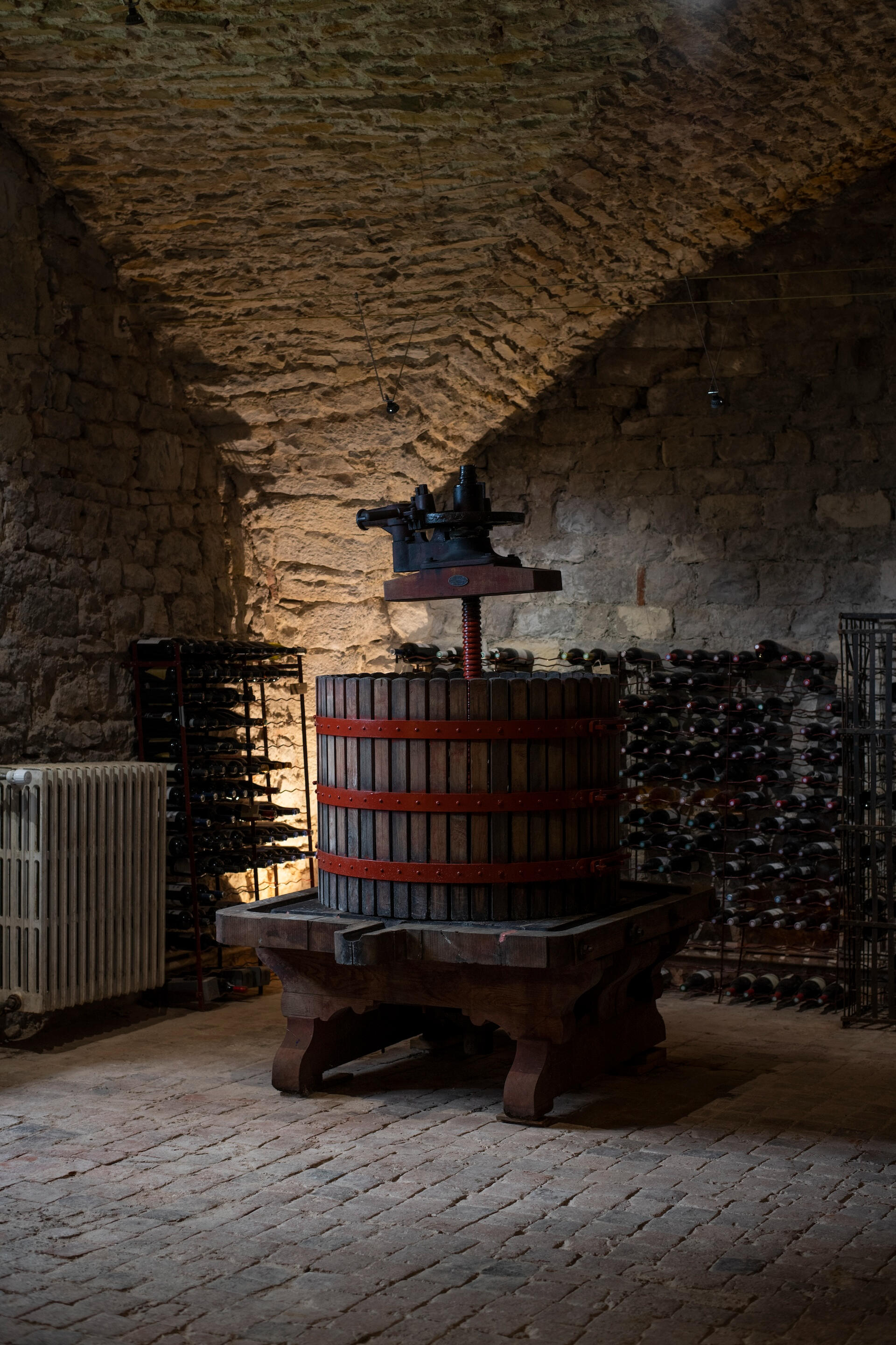 The rib-vaulted cellars are the oldest part of the château – their foundations date to the 11th century. Beneath raw stone vaults and original cobbled floors, they house the estate's private wine cellar: oak barrels, a traditional basket press, and racks where the château's wines age. A tasting table sits among the barrels – a thousand years of stone, and wine at the centre.