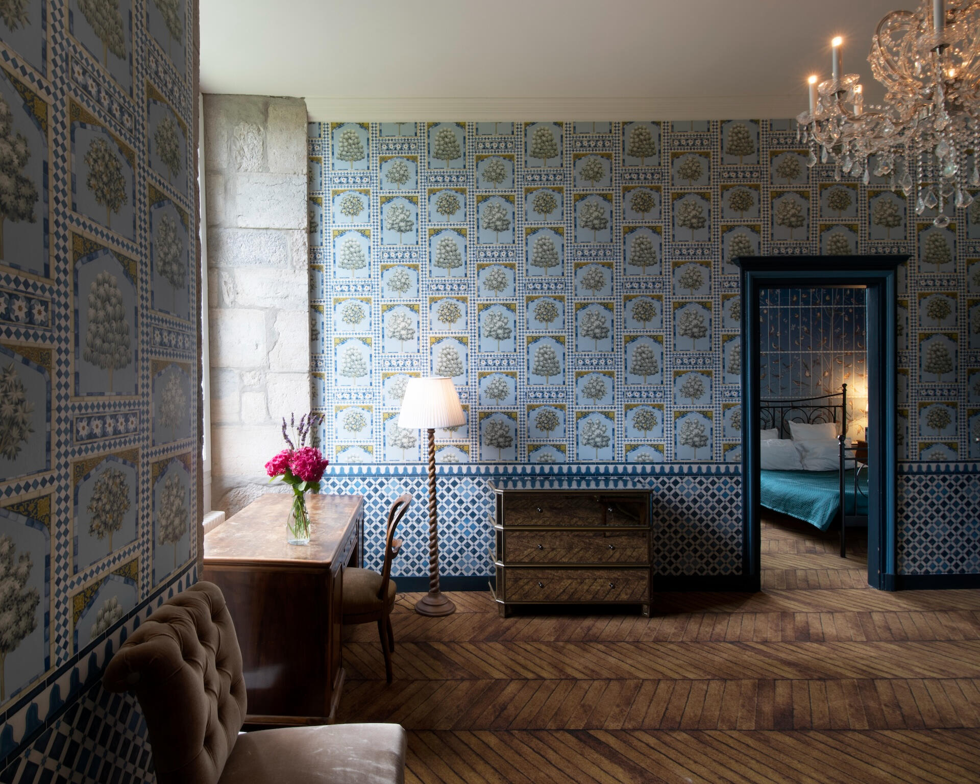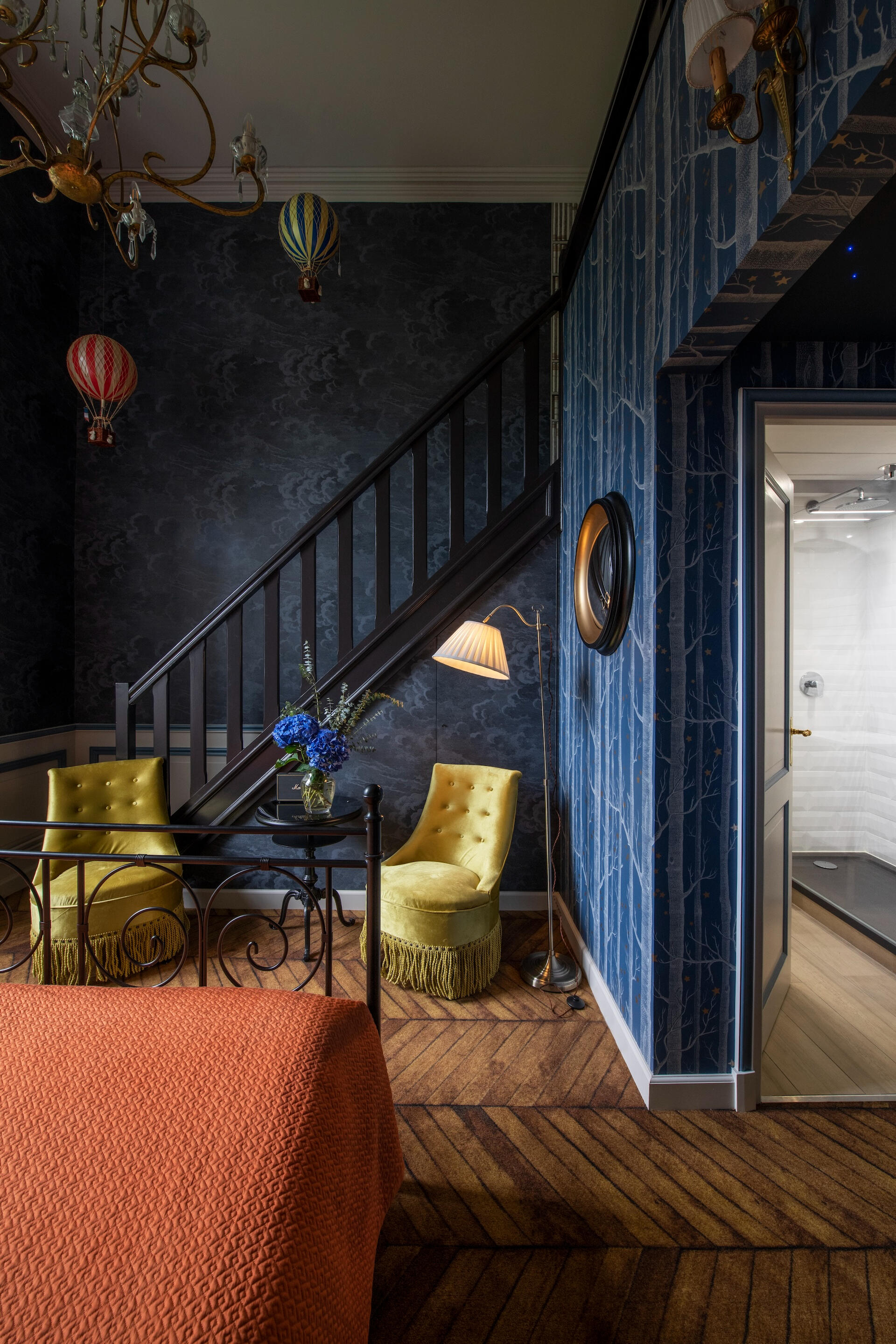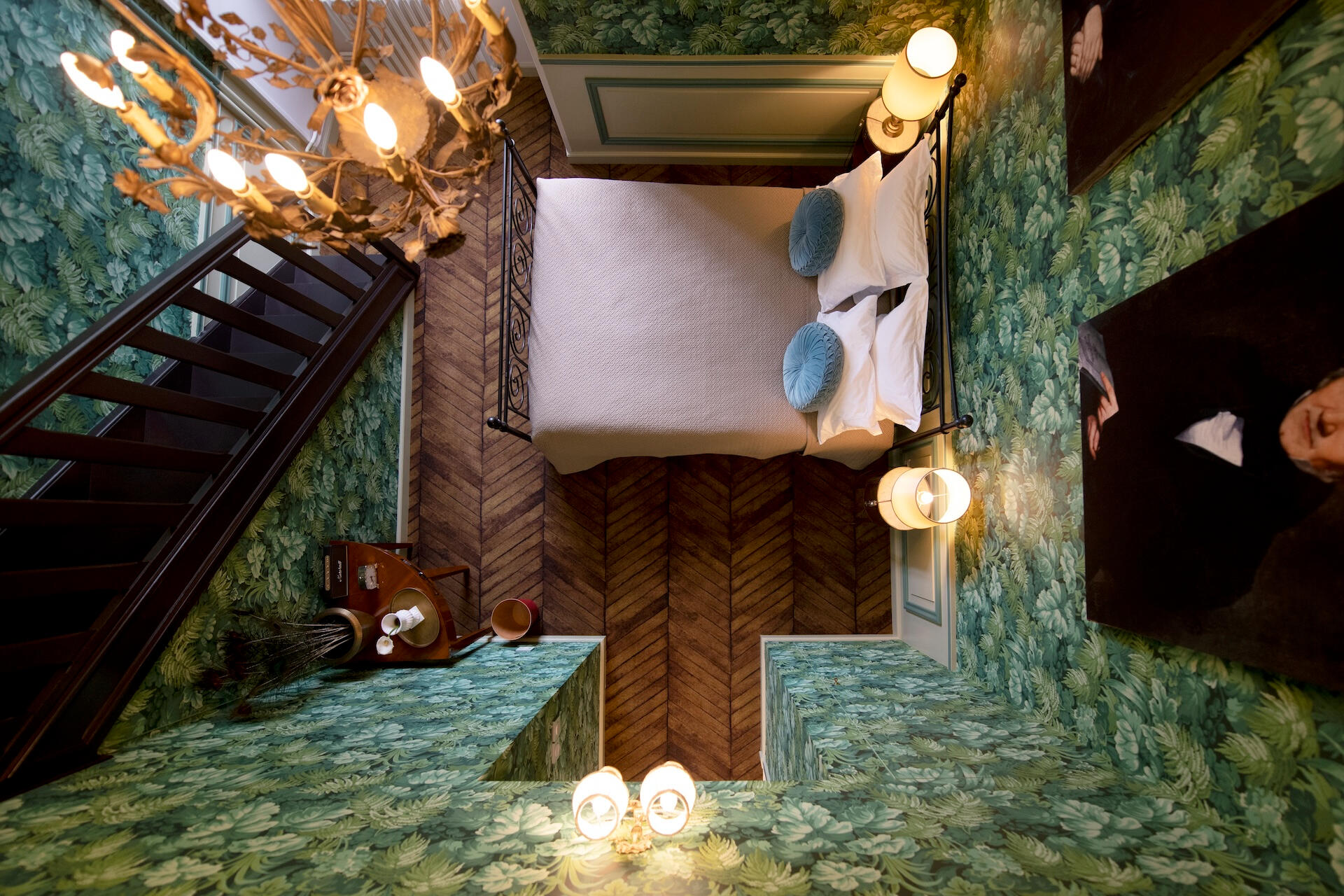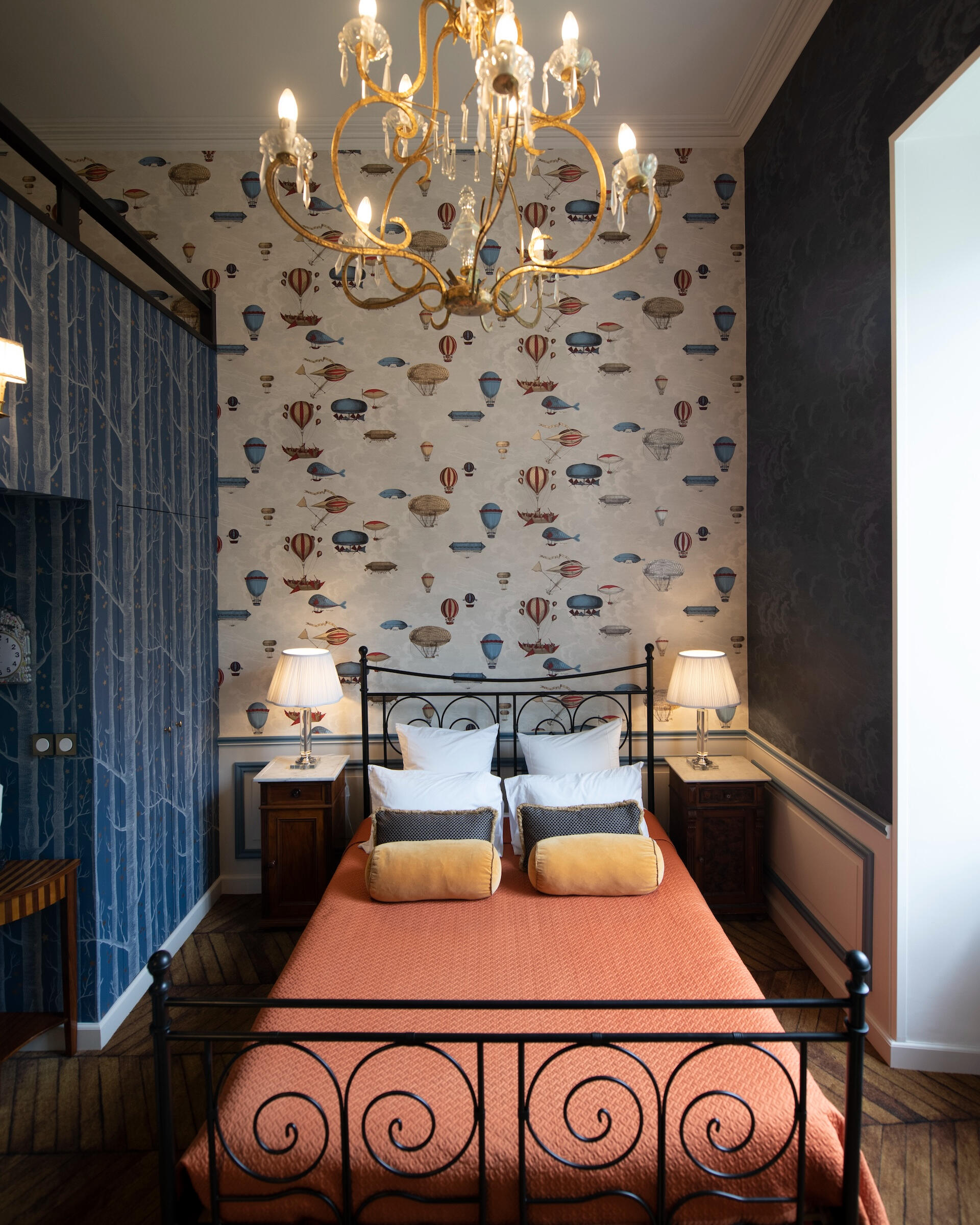 Every bedroom has its own world – bold wallpapers, herringbone parquet, crystal chandeliers, luxurious beds. All are en suite. Some unfold as duplexes, with a mezzanine and separate lounge. From a room of hot air balloons to a tropical green cabinet, from a theatre décor to a blue forest refuge – each door opens onto a different scene.