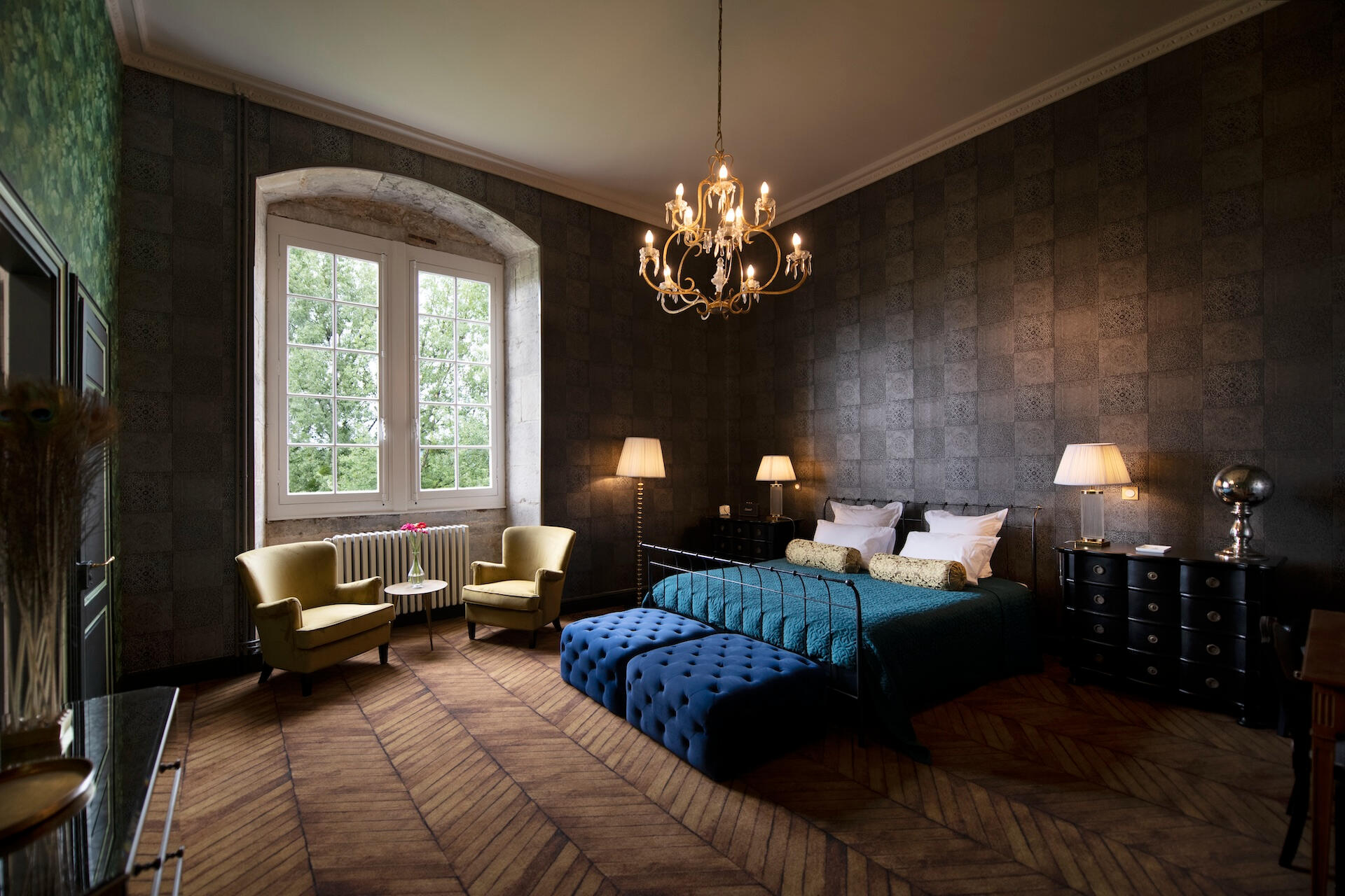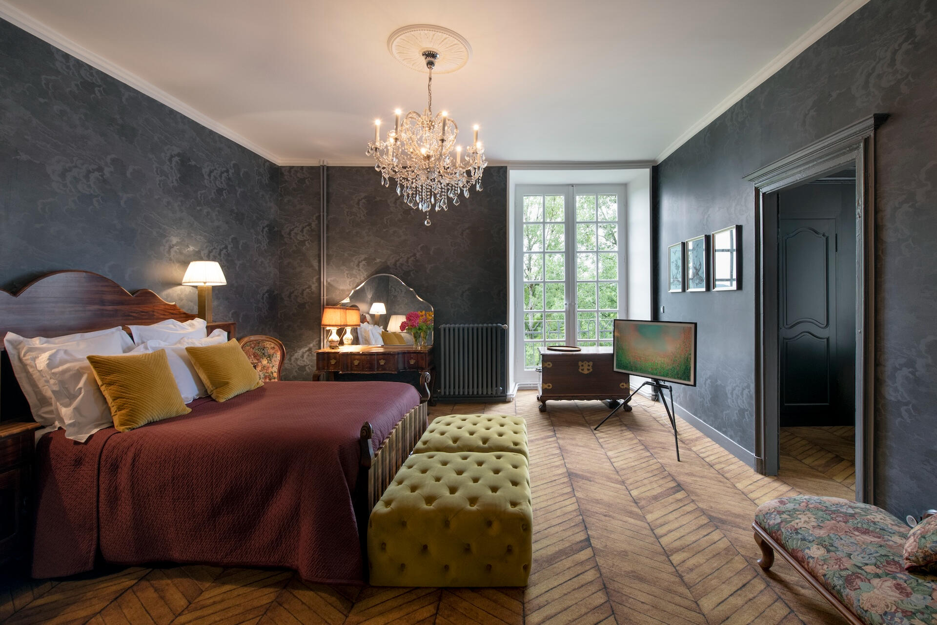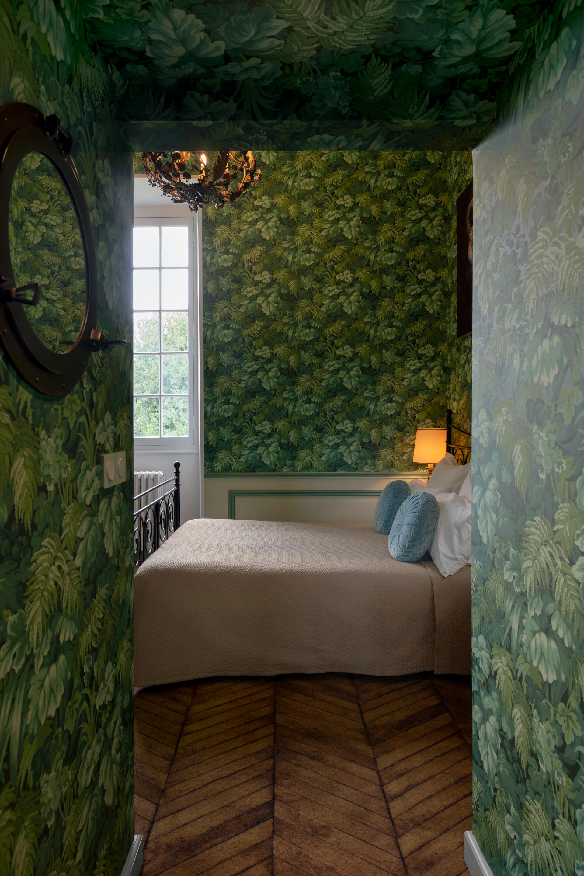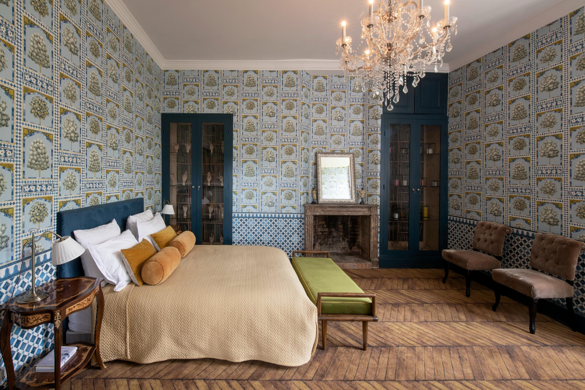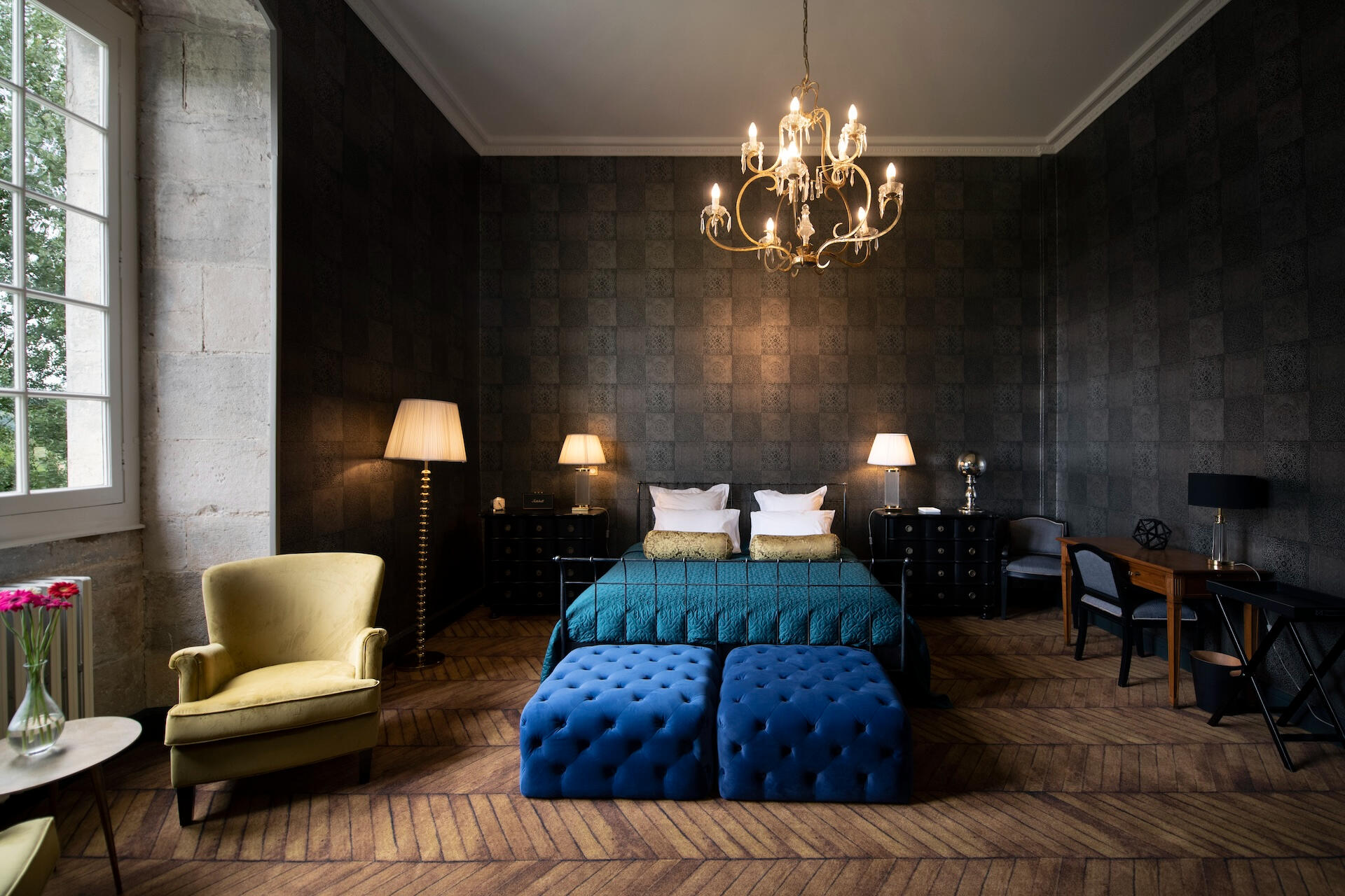 Every bedroom has its own world – bold wallpapers, herringbone parquet, crystal chandeliers, luxurious beds. All are en suite. Some unfold as duplexes, with a mezzanine and separate lounge. From a room of hot air balloons to a tropical green cabinet, from a theatre décor to a blue forest refuge – each door opens onto a different scene.