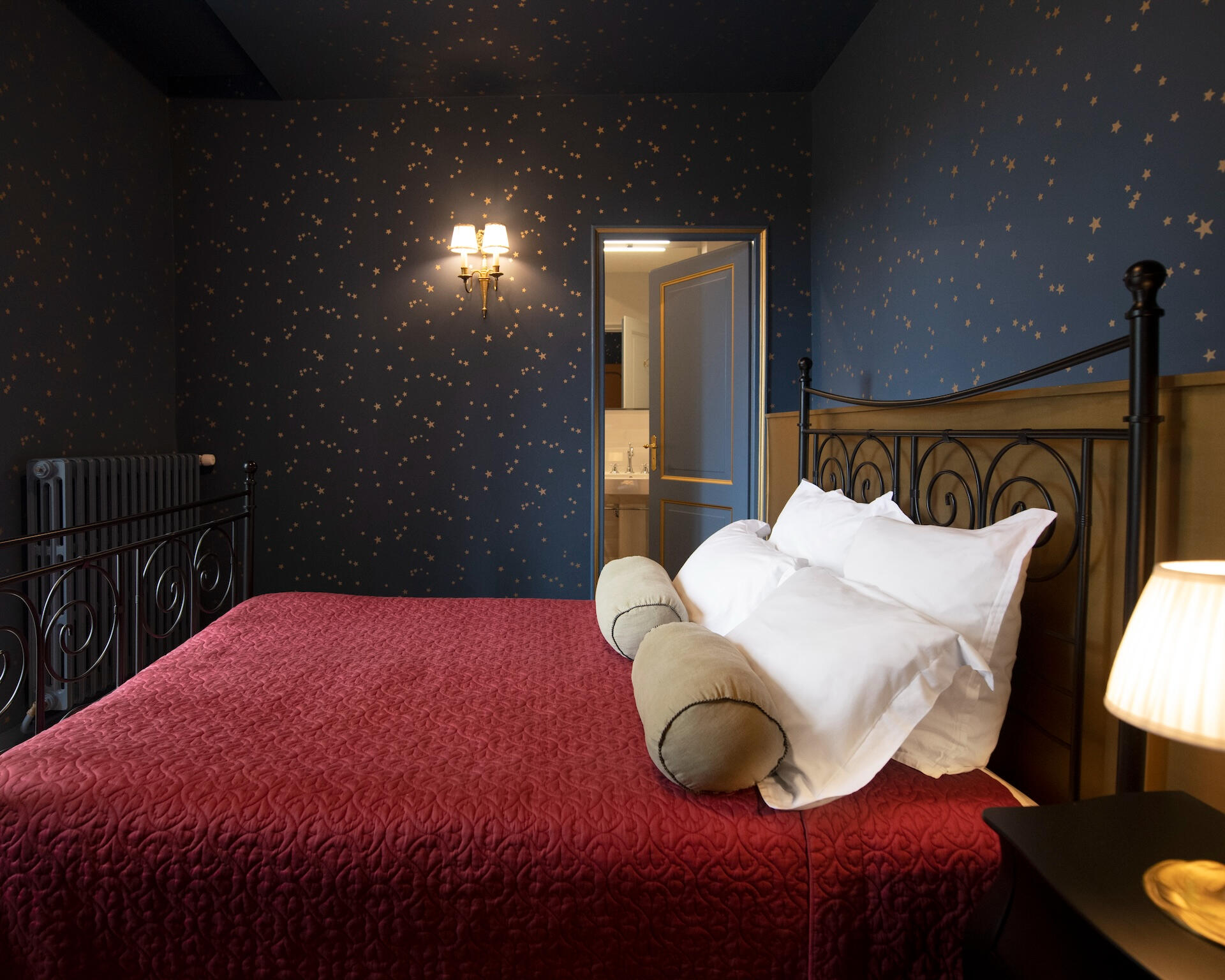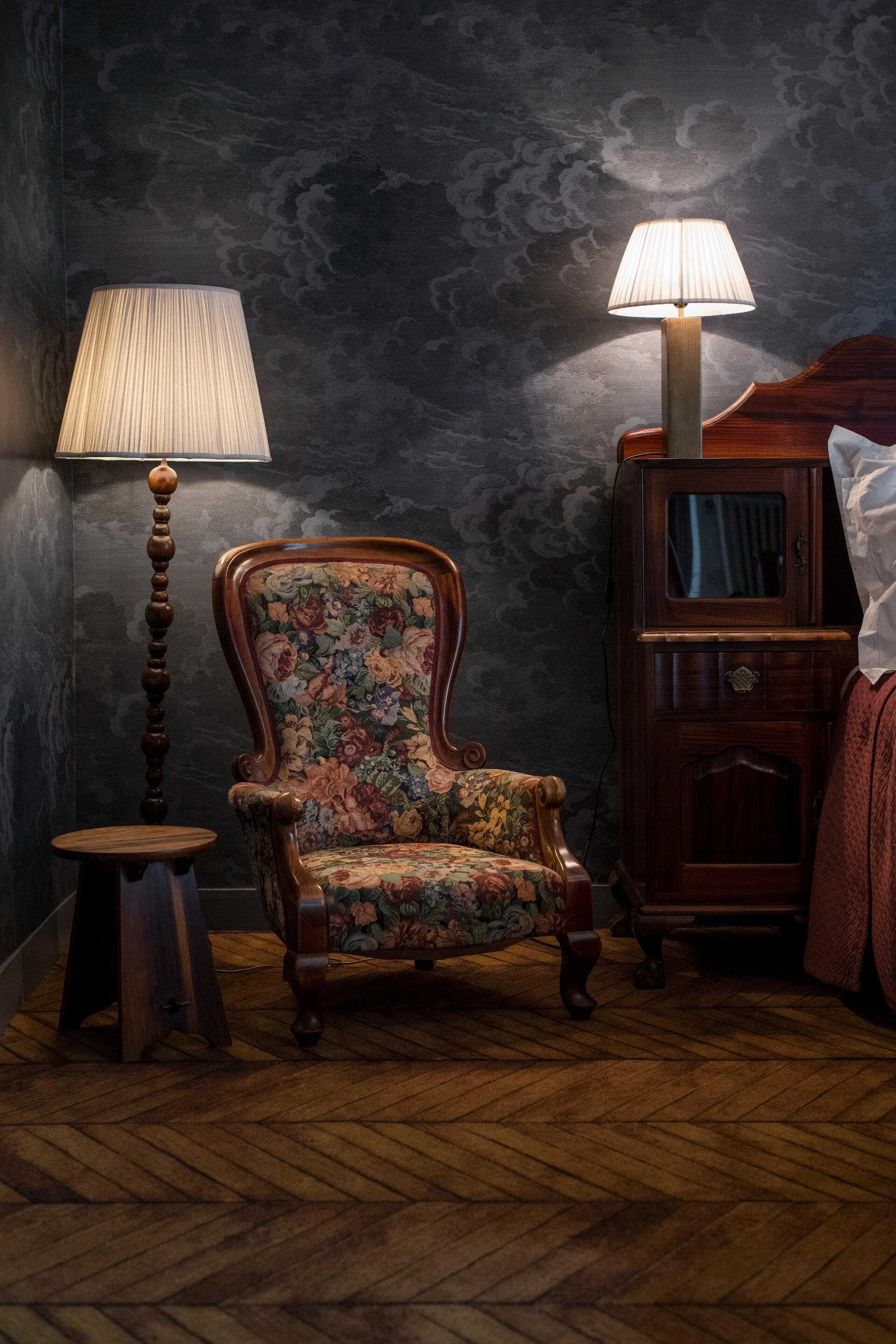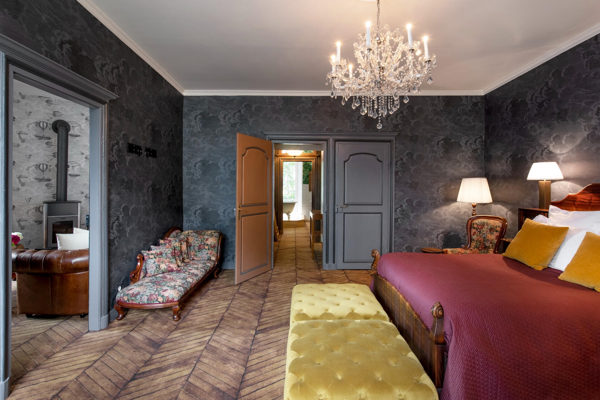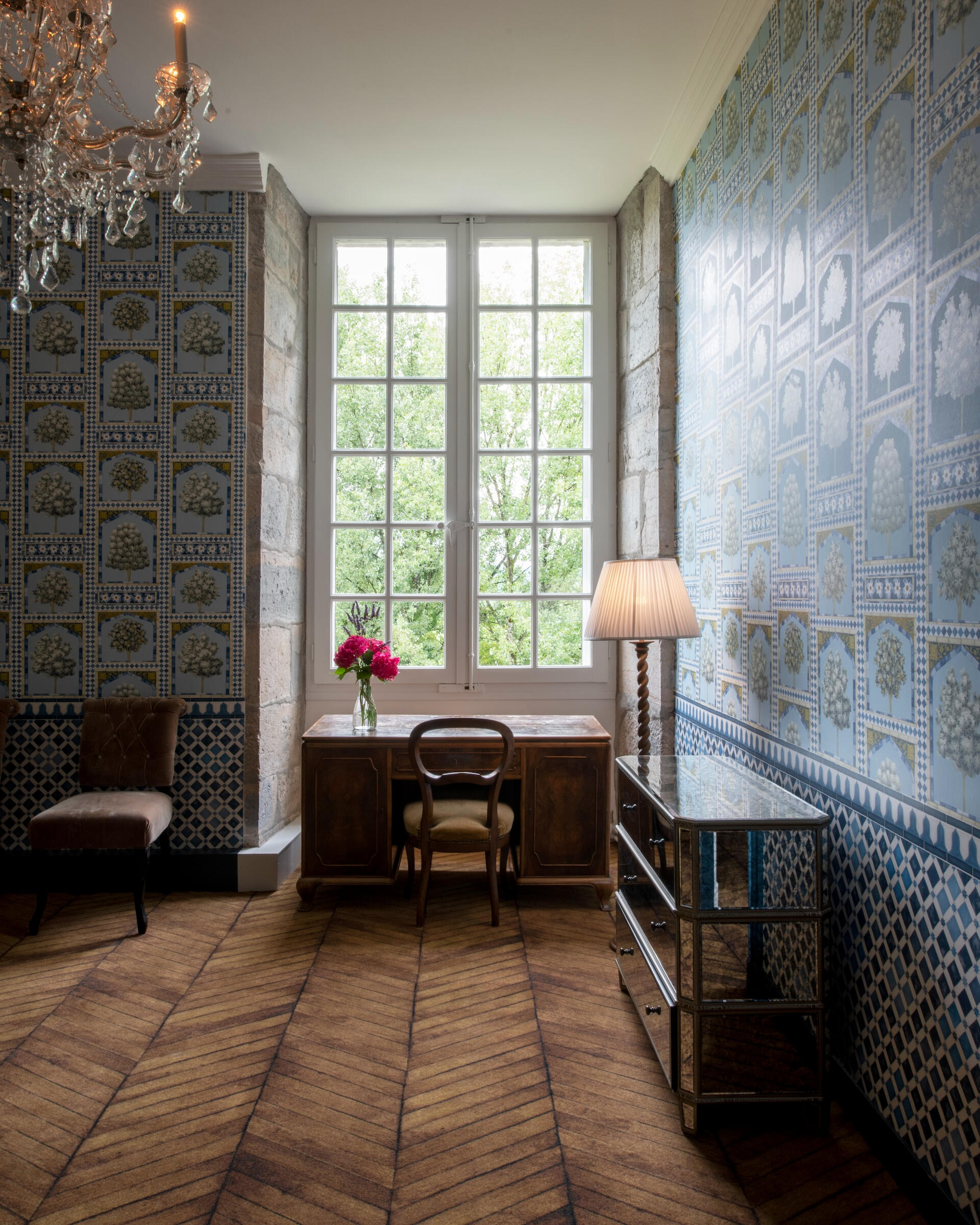 Every bedroom has its own world – bold wallpapers, herringbone parquet, crystal chandeliers, luxurious beds. All are en suite. Some unfold as duplexes, with a mezzanine and separate lounge. From a room of hot air balloons to a tropical green cabinet, from a theatre décor to a blue forest refuge – each door opens onto a different scene.