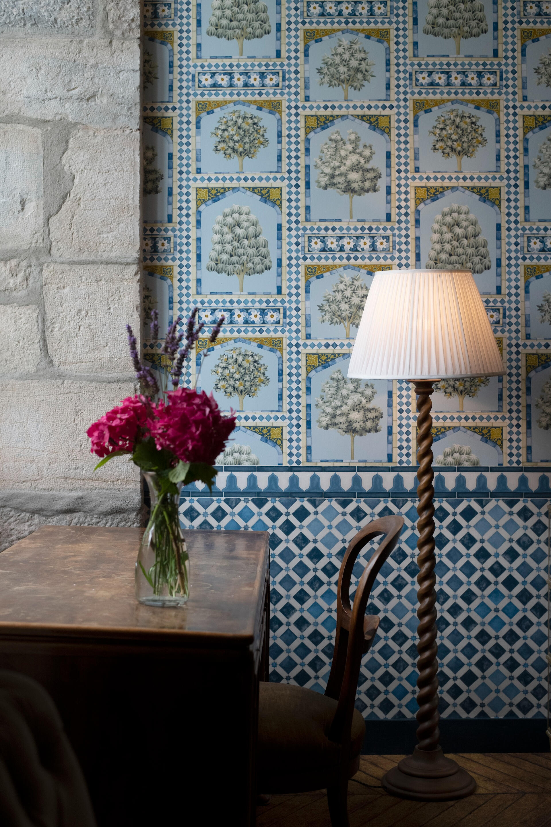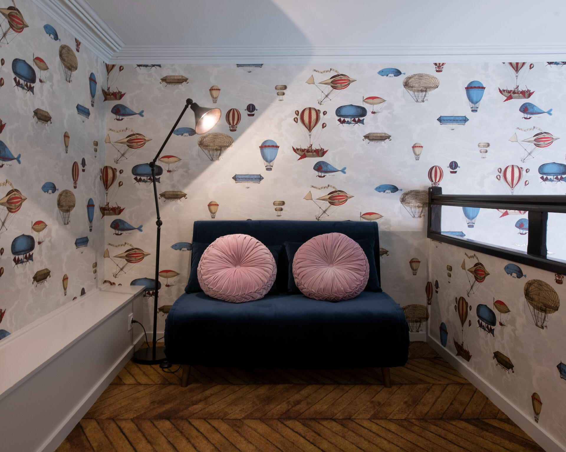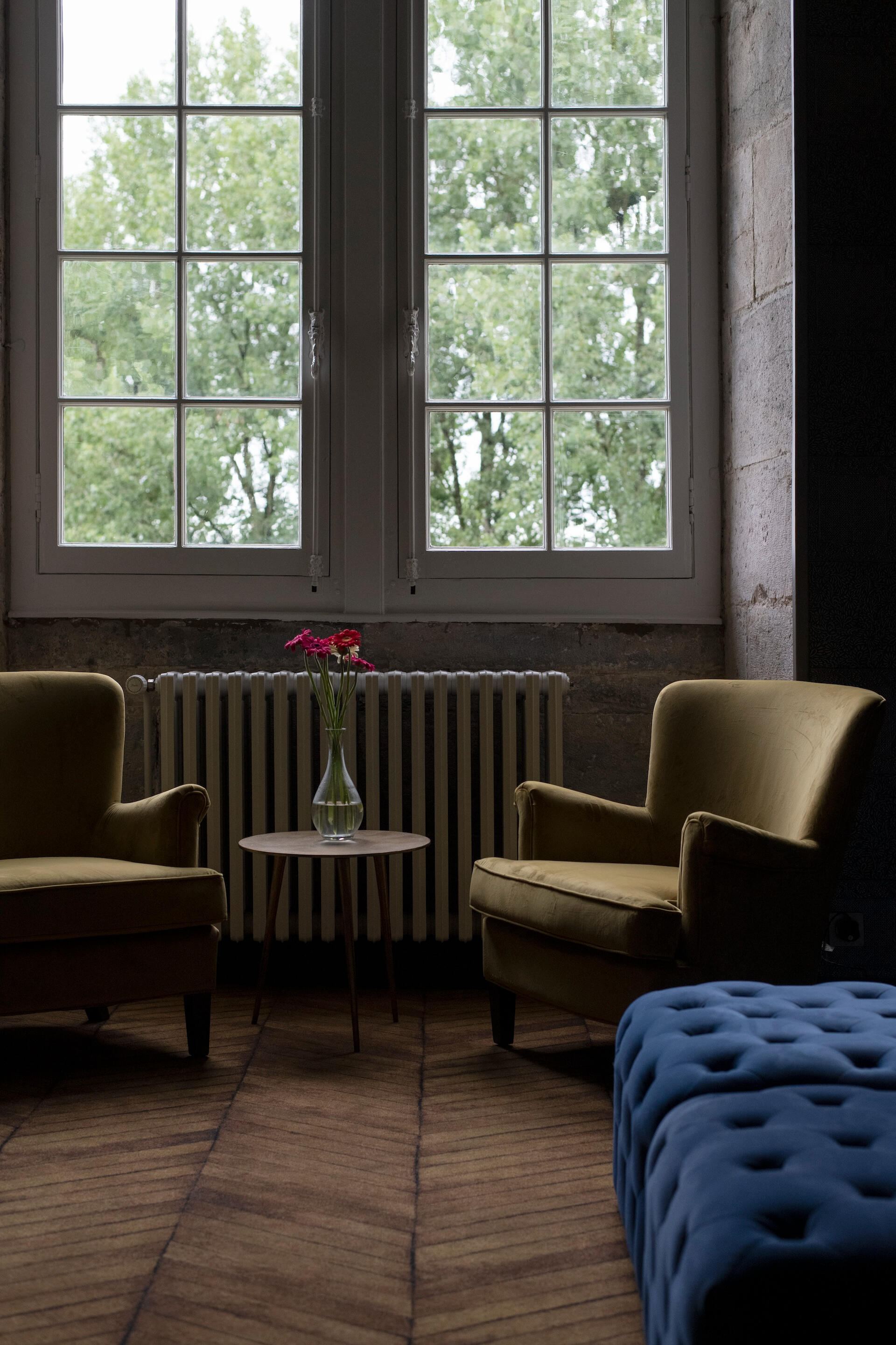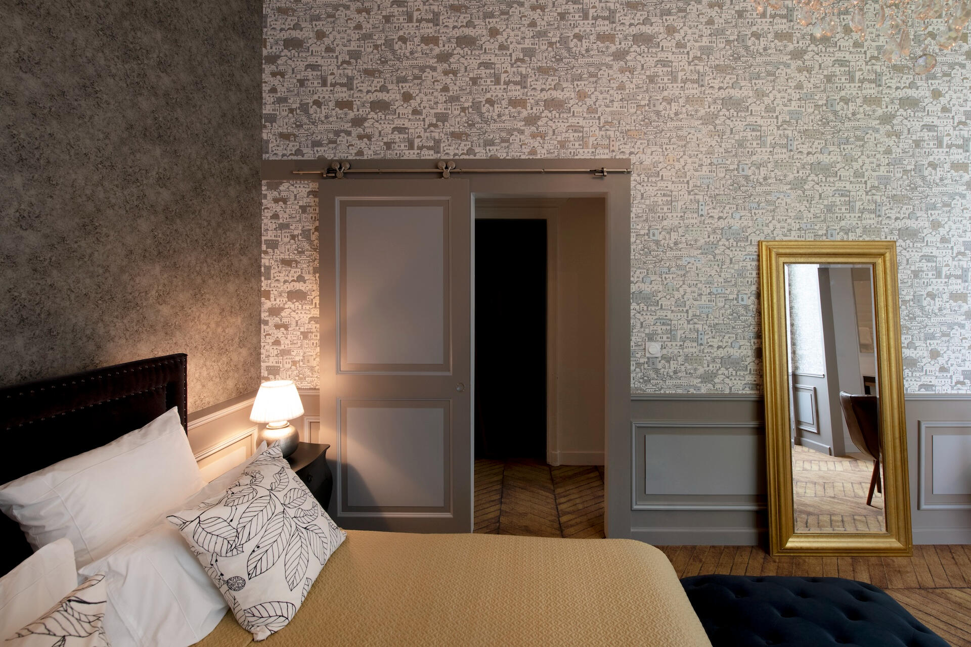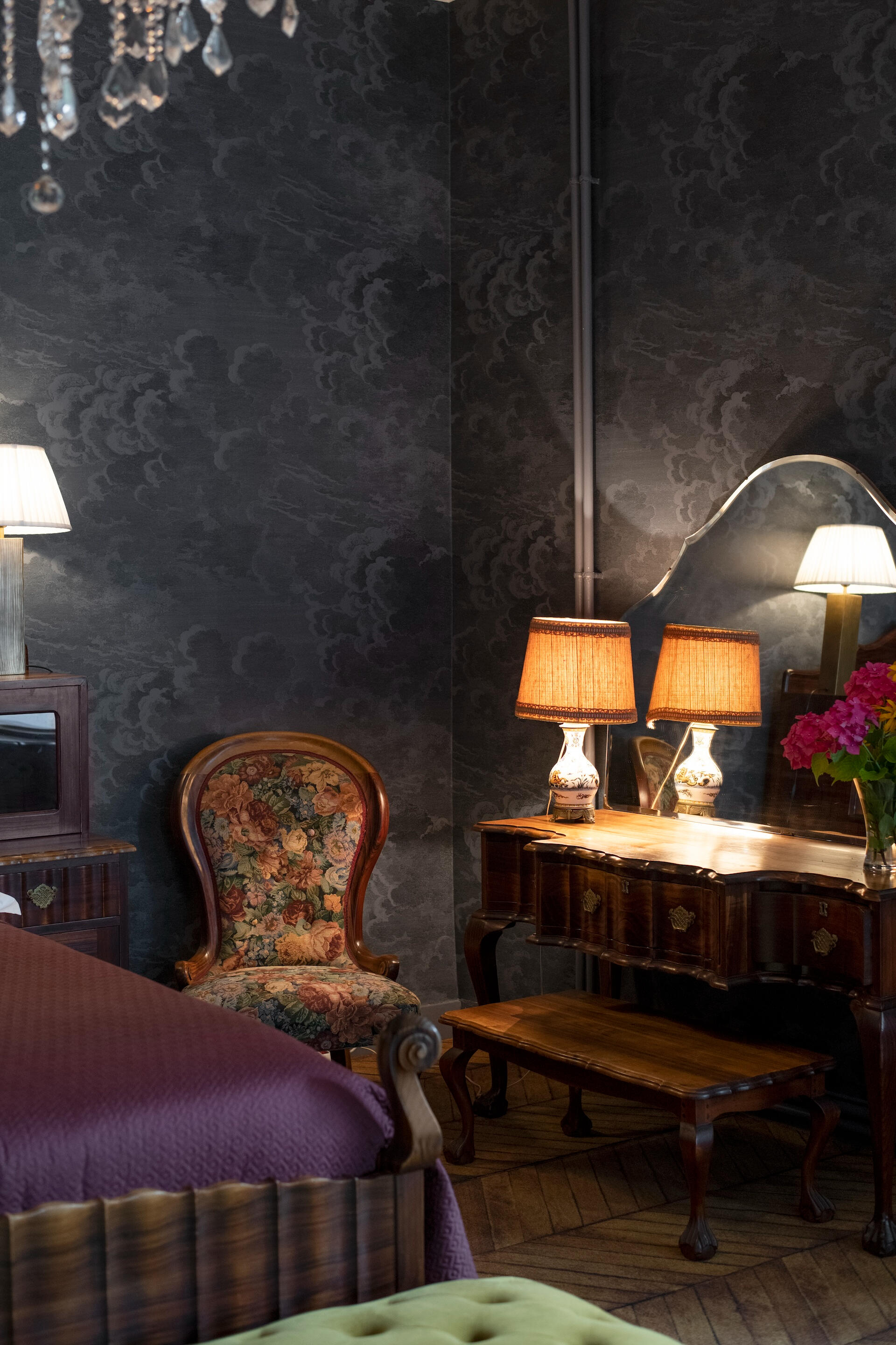 Every bedroom has its own world – bold wallpapers, herringbone parquet, crystal chandeliers, luxurious beds. All are en suite. Some unfold as duplexes, with a mezzanine and separate lounge. From a room of hot air balloons to a tropical green cabinet, from a theatre décor to a blue forest refuge – each door opens onto a different scene.