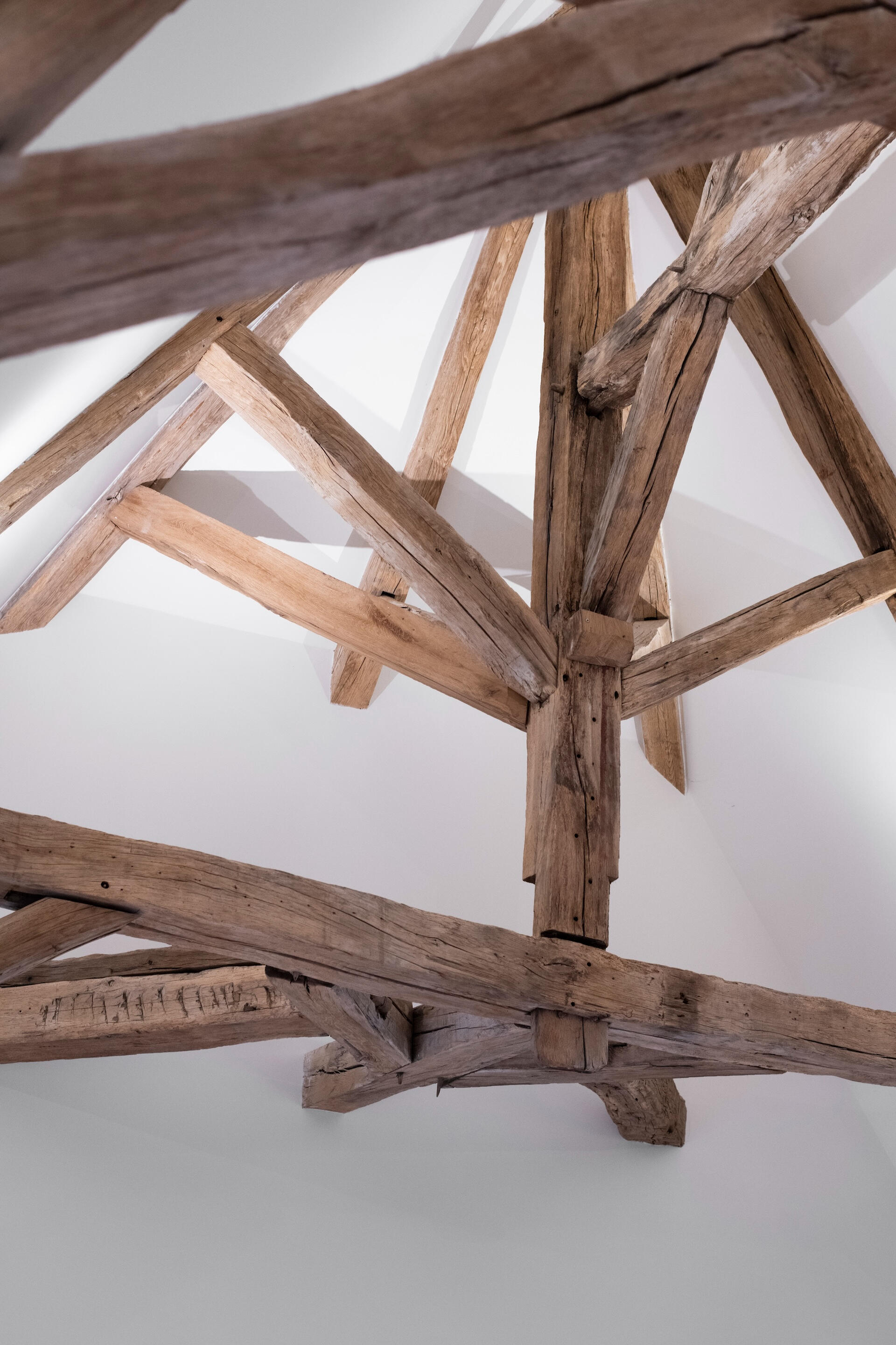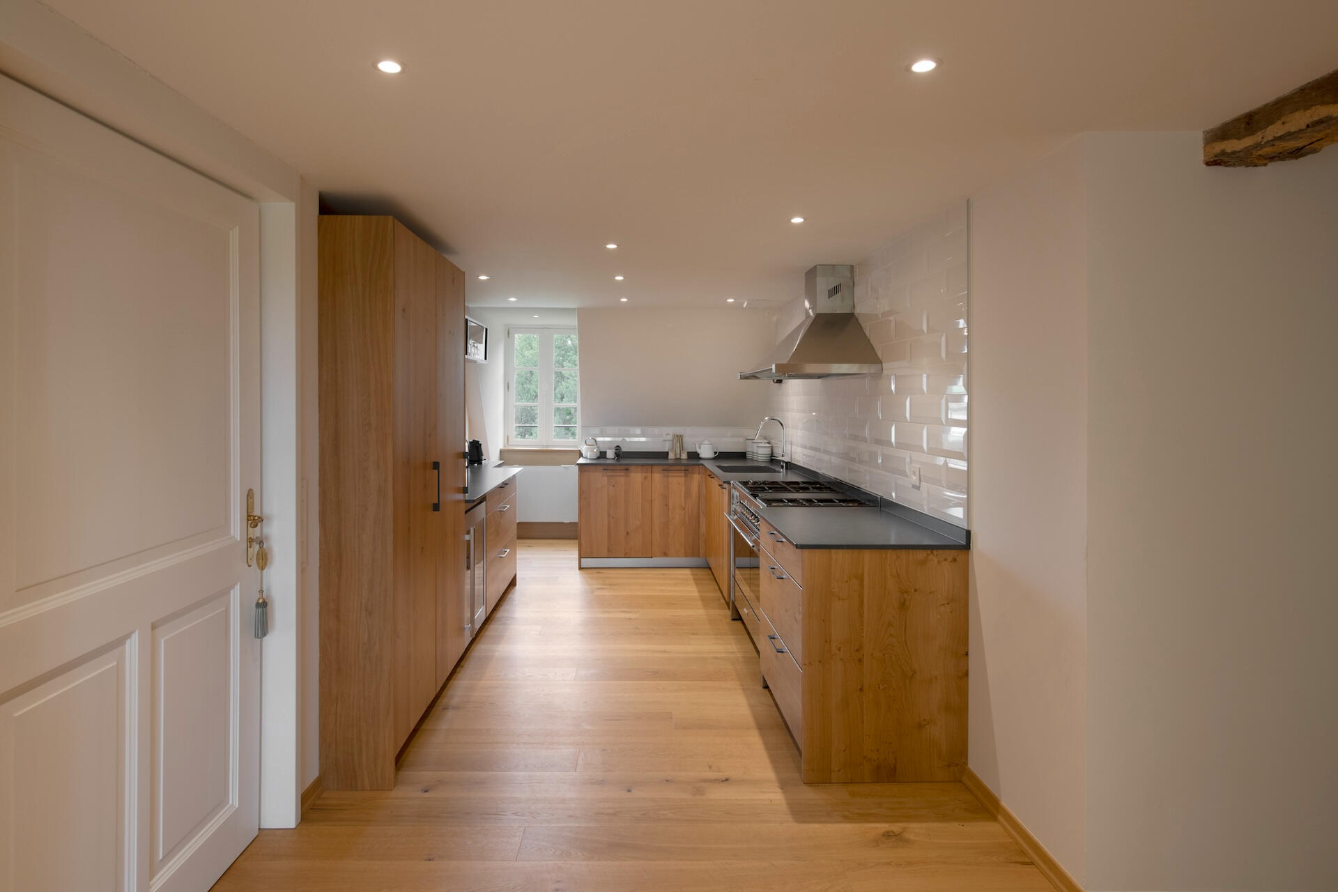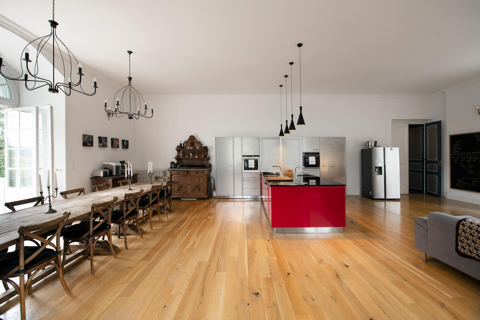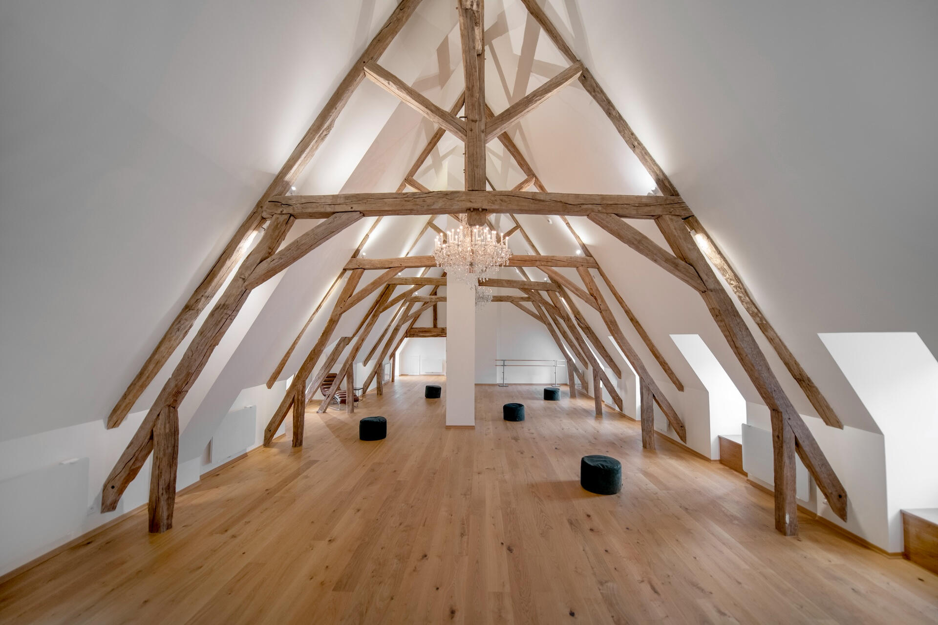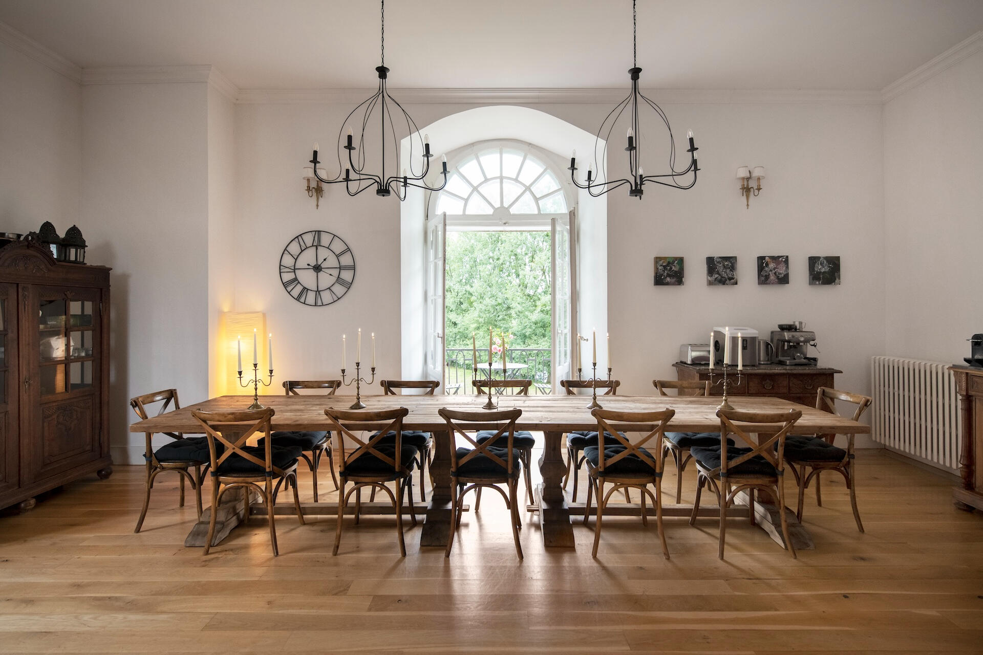 The converted loft runs the full length of the château, from tower to tower. The original timber frame – a massive lattice of oak beams – rises to full height beneath the roof. Light oak floors, white walls, a crystal chandelier hung between the trusses, and a fully equipped kitchen: the former attic has become a great reception hall where raw timber and the light of the oculus are all the decoration needed.