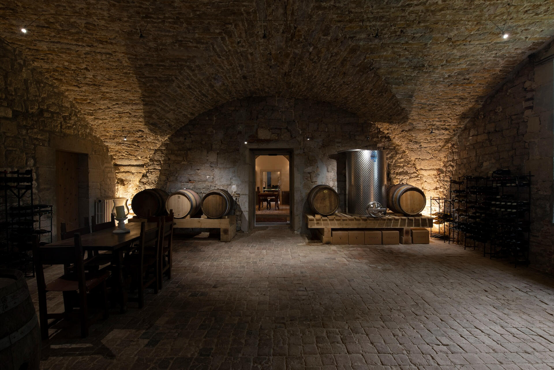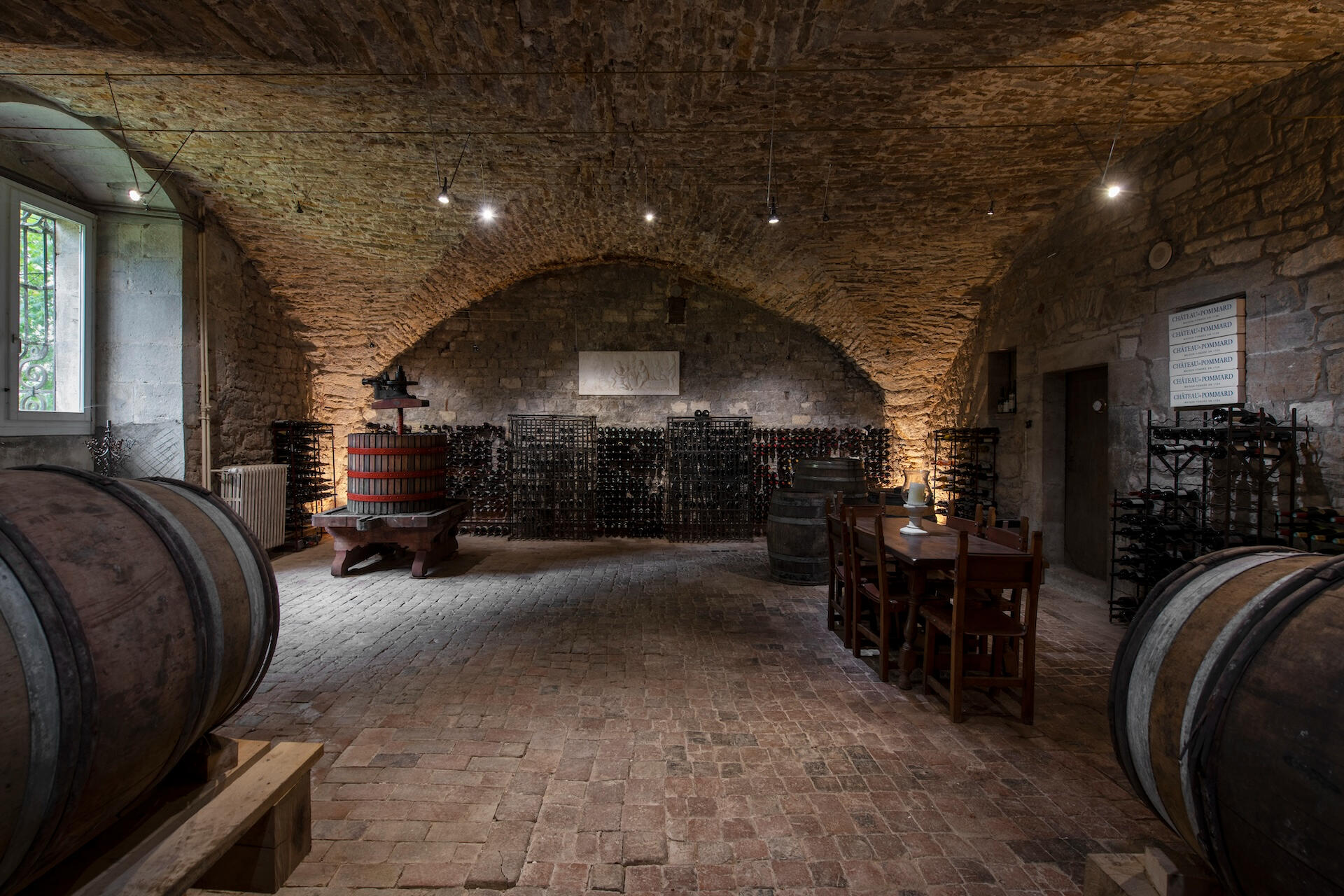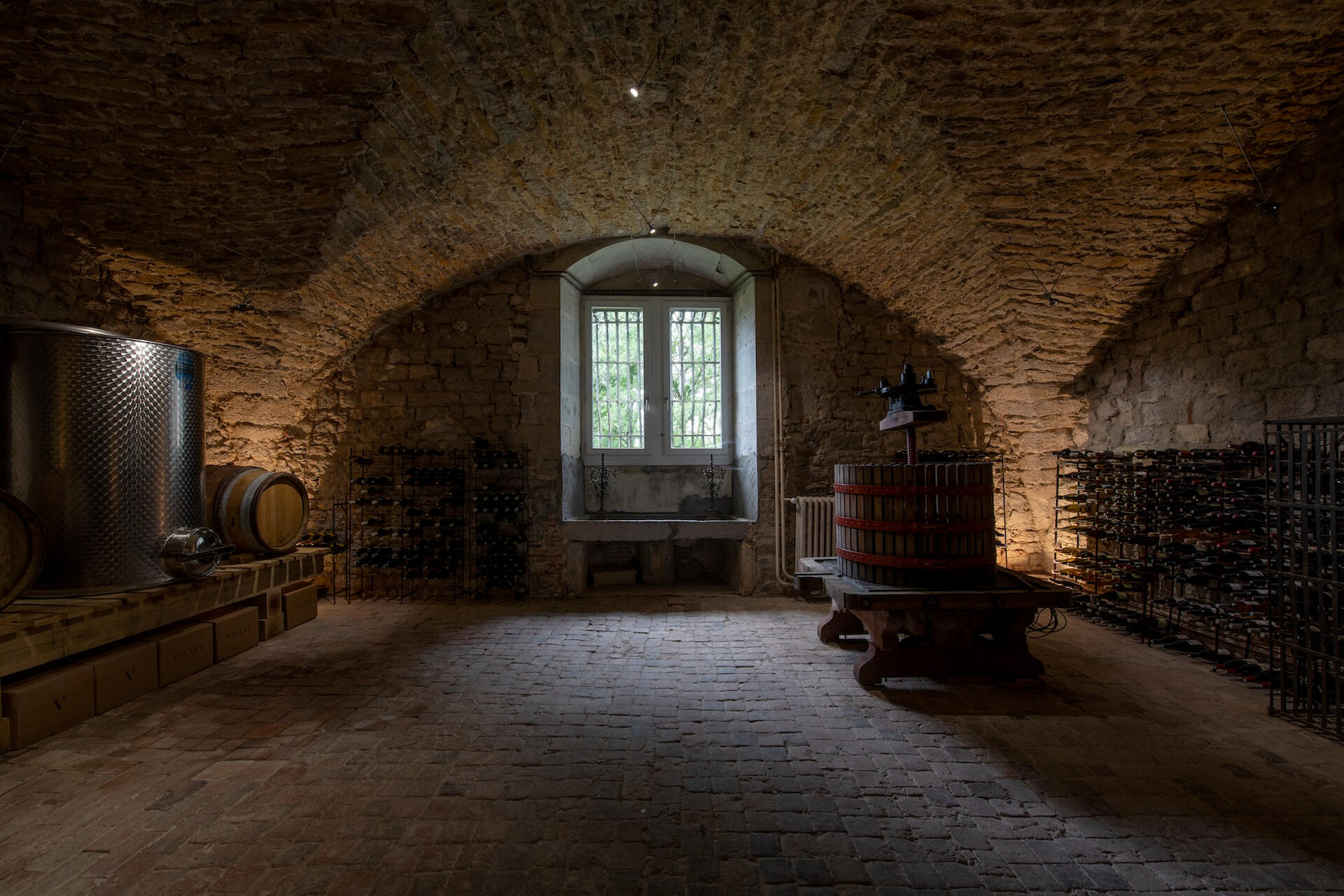 The rib-vaulted cellars are the oldest part of the château – their foundations date to the eleventh century. Beneath raw stone vaults and original cobbled floors, they house the estate's private wine cellar: oak barrels, a traditional basket press, and racks where the château's wines age in silence. A tasting table sits among the barrels – a thousand years of stone, and wine at the centre.
