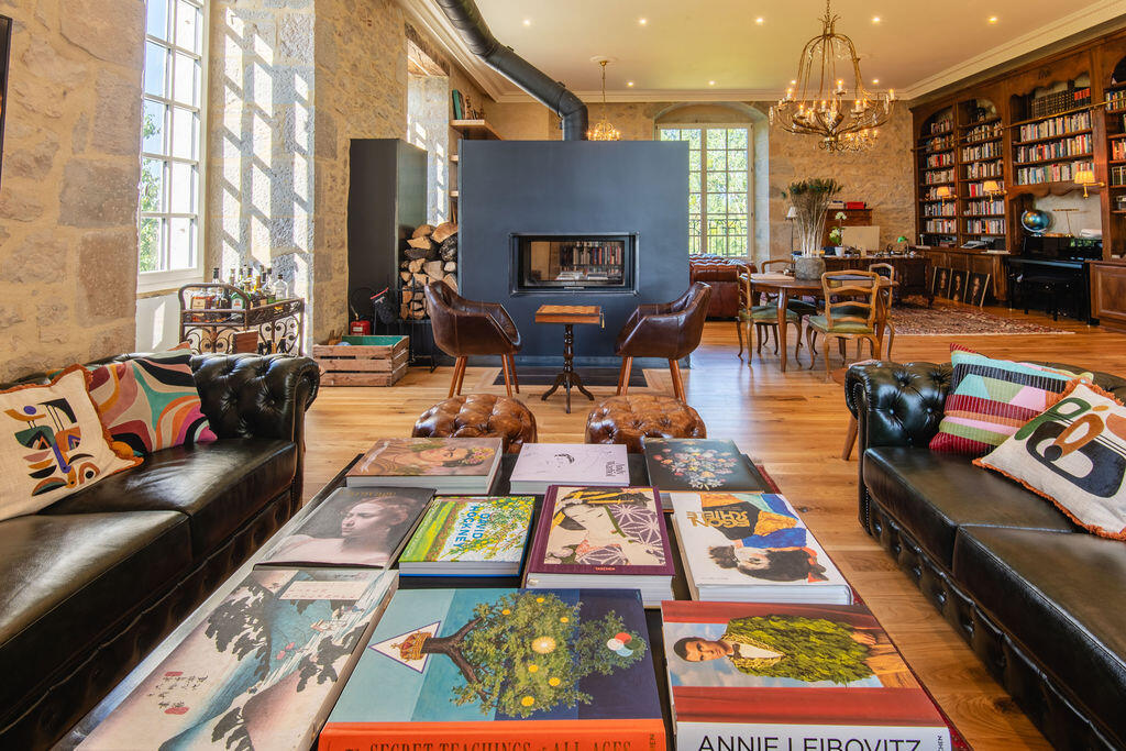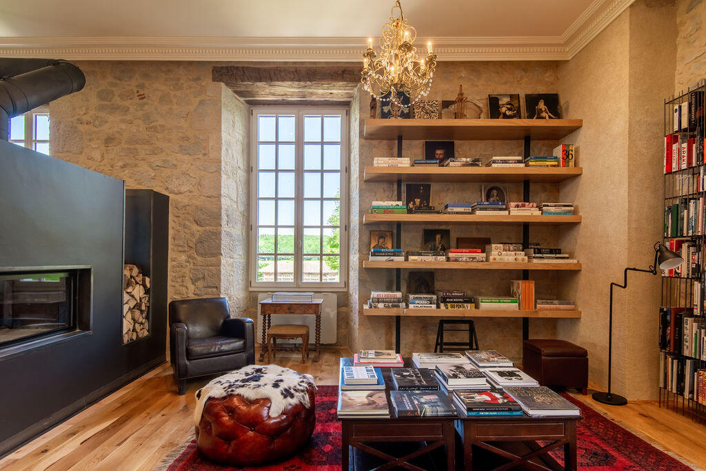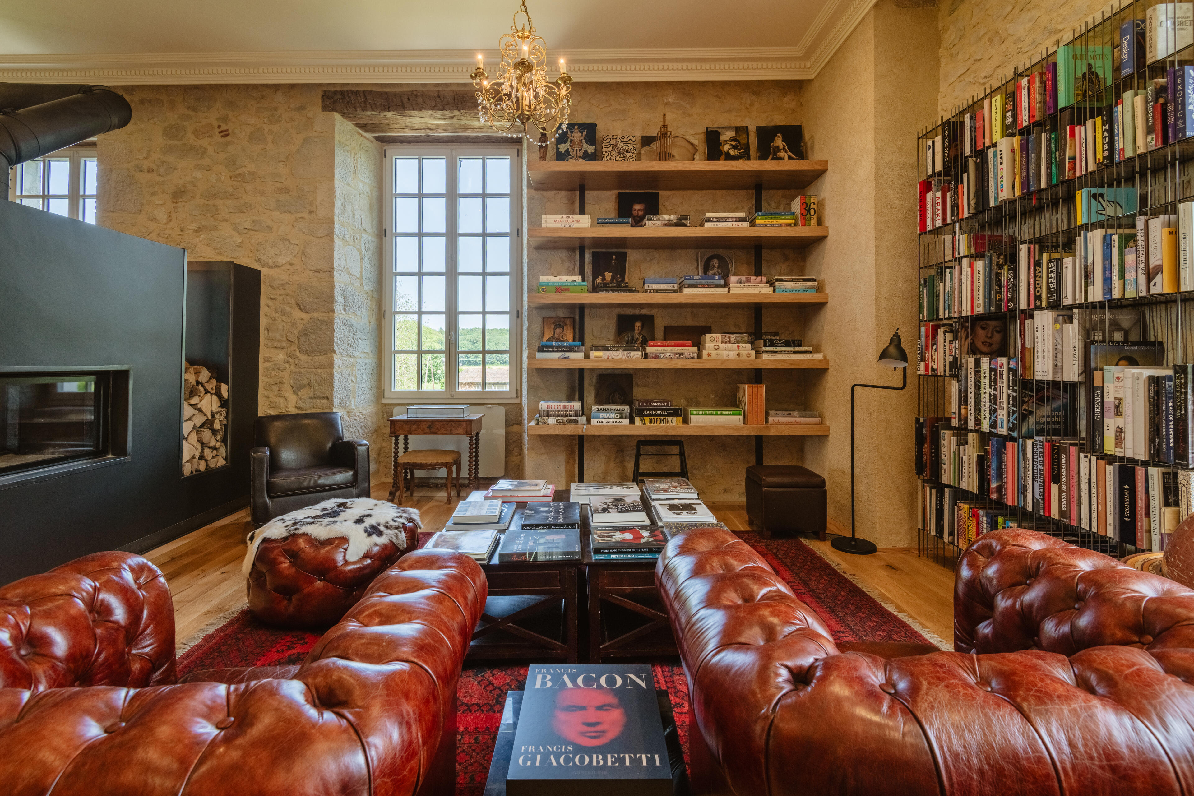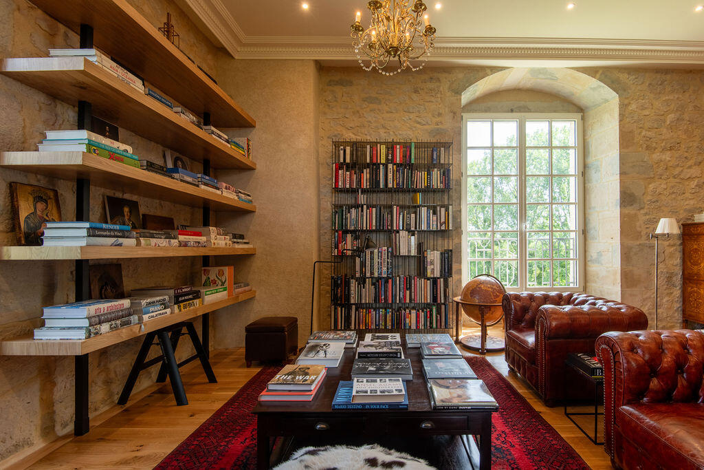 The library occupies the heart of the château – a great stone salon where books are everywhere. Walnut shelving with a rolling ladder, open racks, art monographs spread across the coffee tables. A contemporary double-sided fireplace divides the space between reading corner and study. Chesterfields, Persian rugs, arched windows onto the park and the Loue – a room made in equal measure for conversation, reading, and silence.