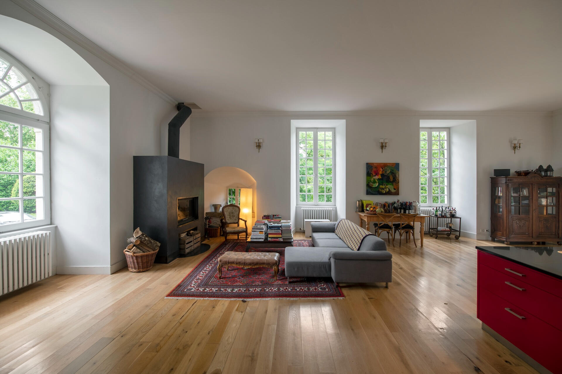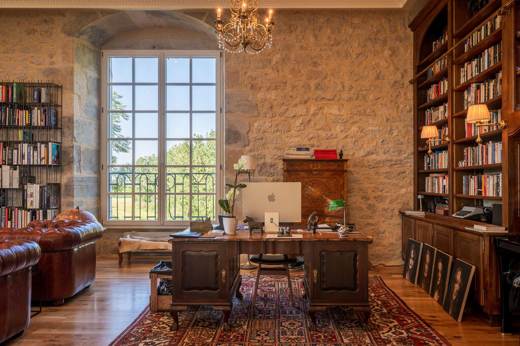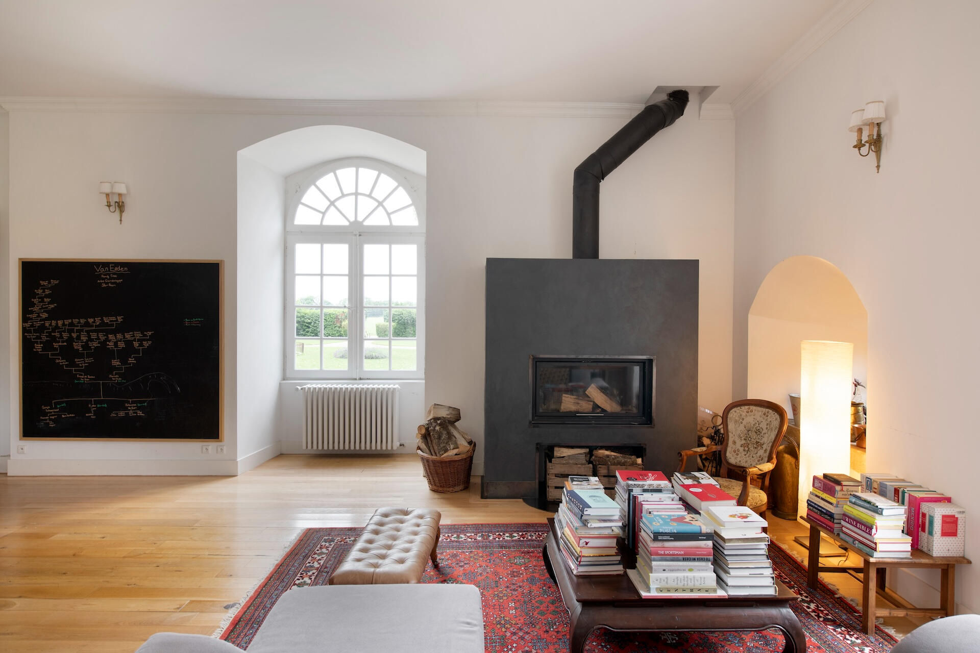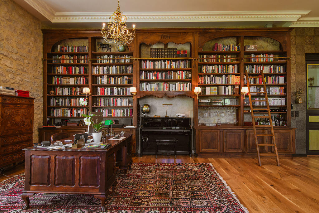 The library occupies the heart of the château – a great stone salon where books are everywhere. Walnut shelving with a rolling ladder, open racks, art monographs spread across the coffee tables. A contemporary double-sided fireplace divides the space between reading corner and study. Chesterfields, Persian rugs, arched windows onto the park and the Loue – a room made in equal measure for conversation, reading, and silence.